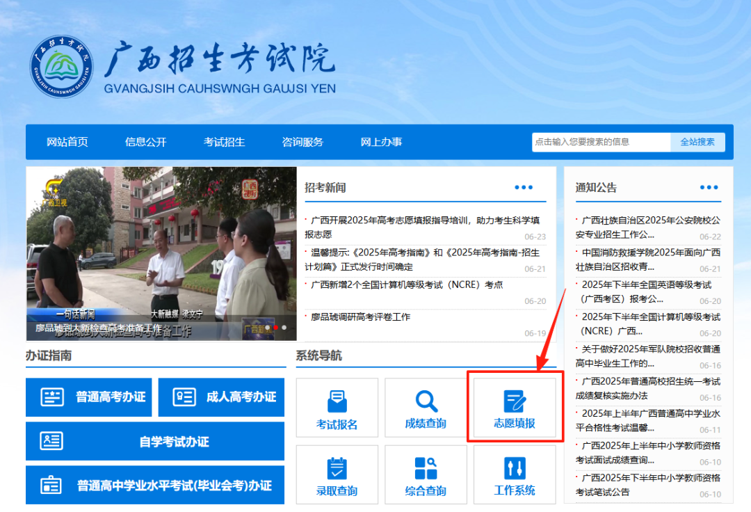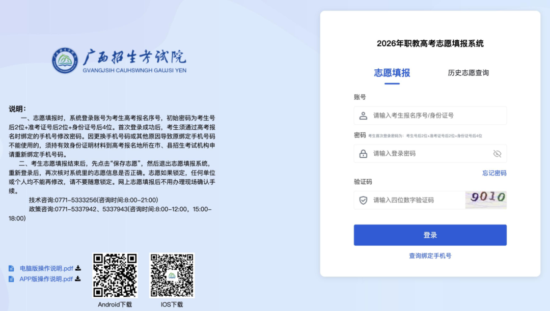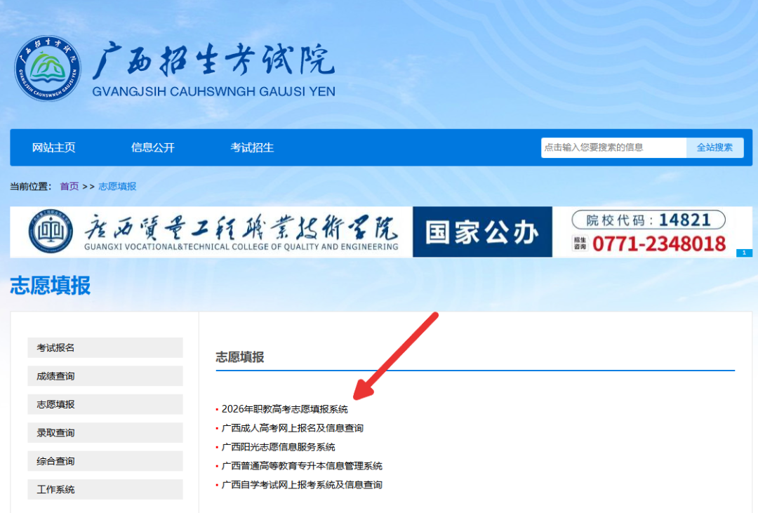 1.通过电脑端填报的考生,须在志愿填报规定时间内登录“广西招生考试院”网站(填报志愿的唯一网站),点击“志愿填报”栏目,在“2026年职教高考志愿填报系统”(以下简称志愿填报系统)中进行填报。