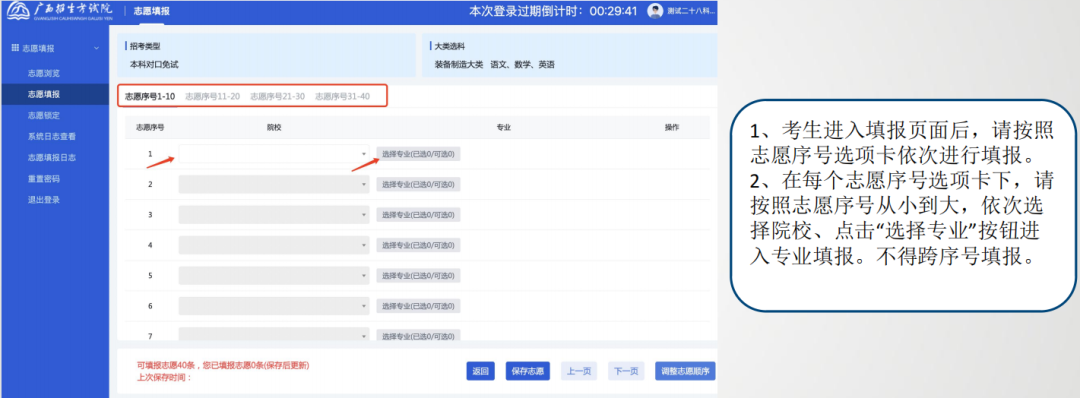 考生填报志愿时,每次登录系统后的有效操作时间为30分钟。因此,建议考生先将有关志愿信息(院校代号、院校名称、专业组、专业代号、专业名称等)在草稿上整理好,登录系统后按整理好的内容进行选择即可。