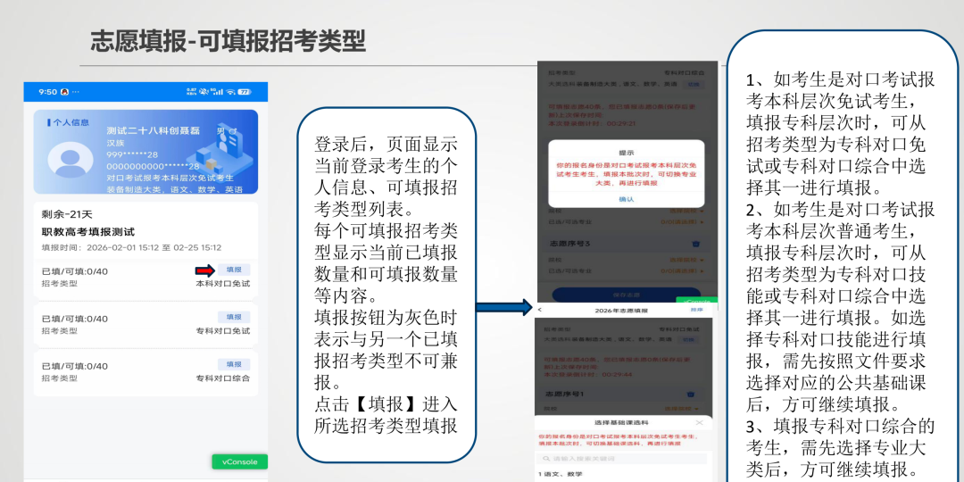 考生登录后,页面显示当前登录考生的个人信息、剩余填报时间和可填报招考类型列表,考生可根据报名时的类型点击【填报】进入当前招考类型进行填报。