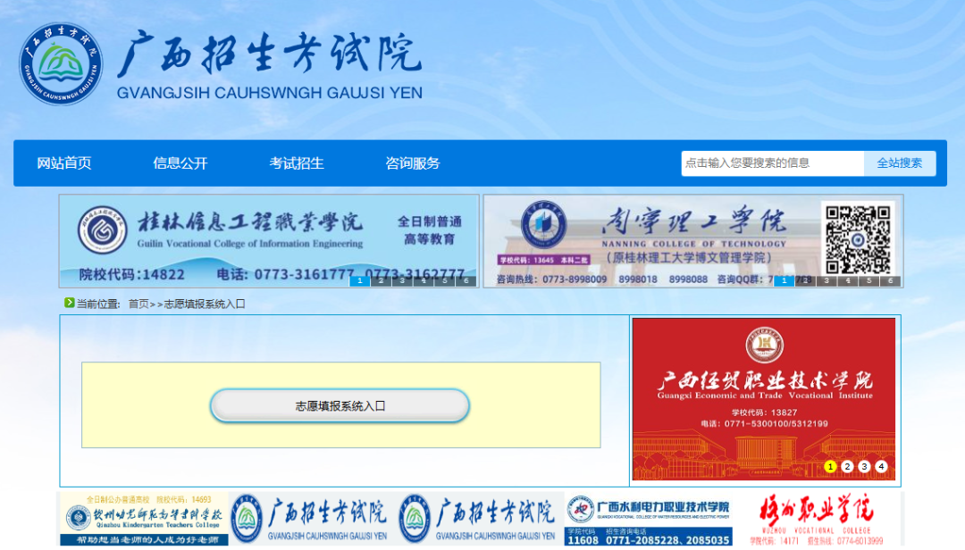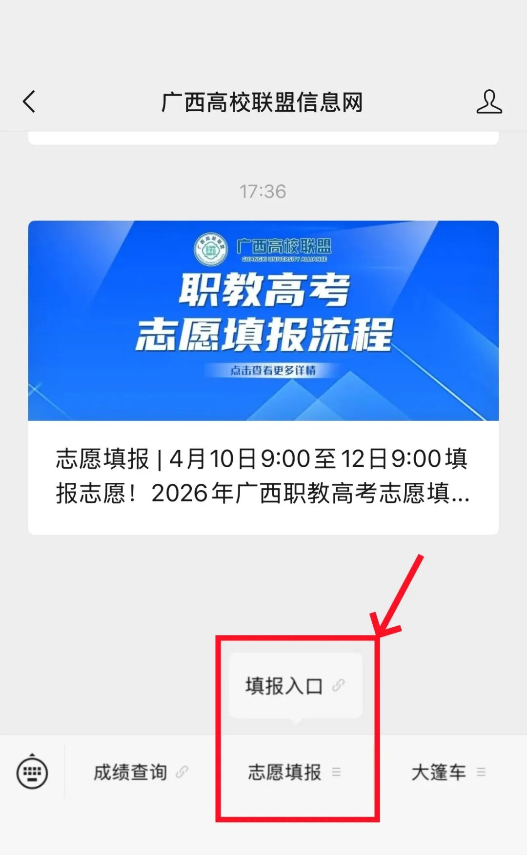 关注【广西高校联盟信息网】公众号,点击公众号菜单栏【志愿填报】可直达填报系统。