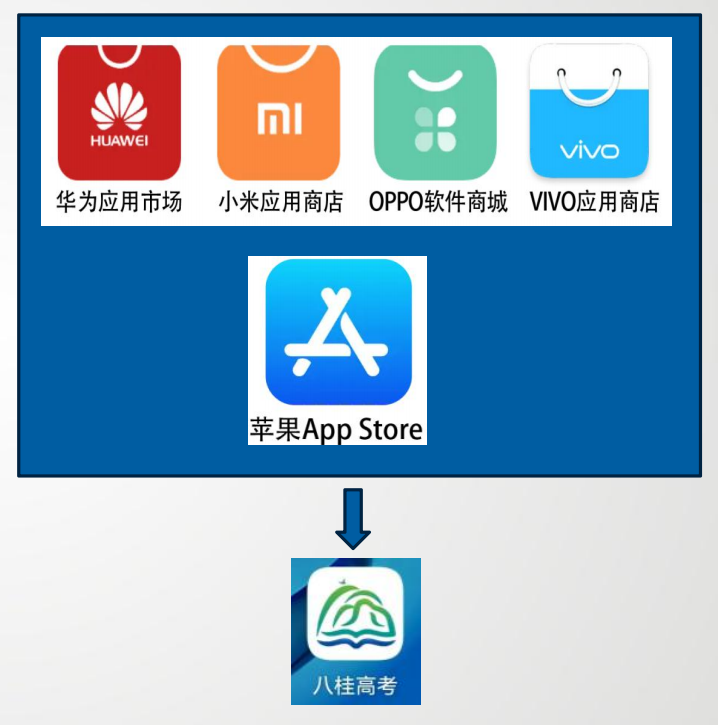 考生须先从华为、小米、OPPO、vivo、苹果等手机的应用市场,搜索“八桂高考”app,安装后,在志愿填报规定时间内通过“八桂高考”app进行填报;已安装过的请通过应用市场升级到最新版本。