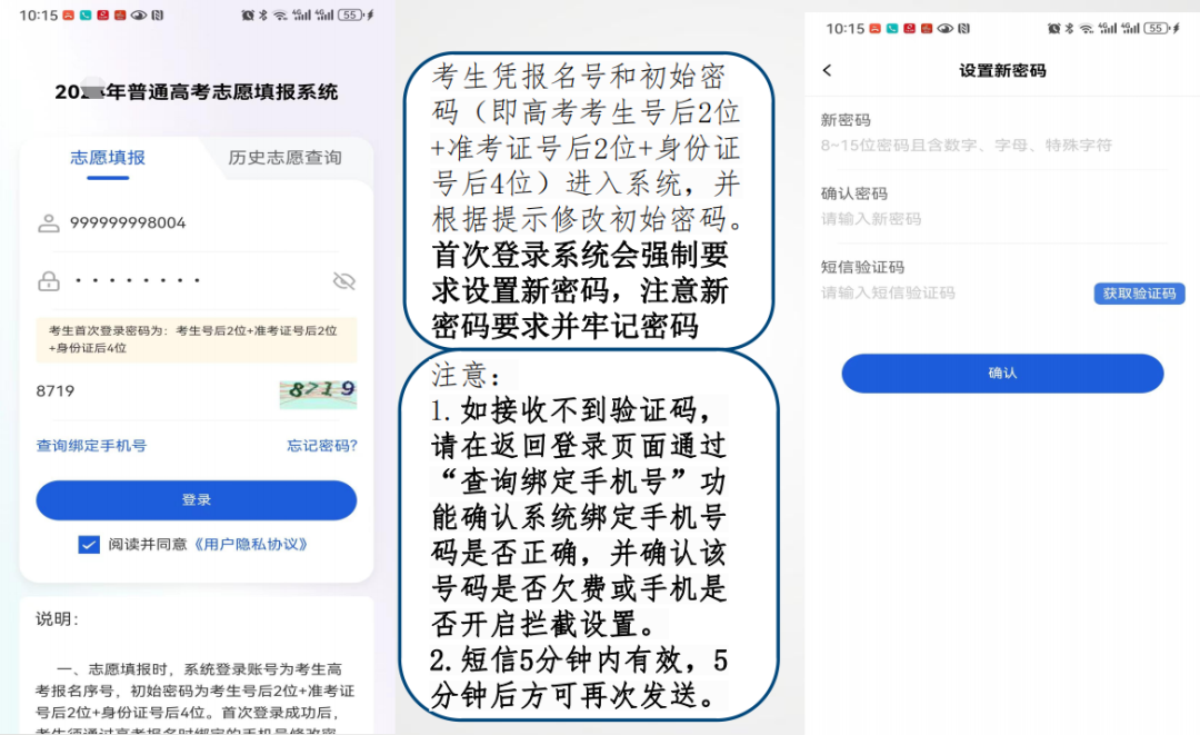 考生凭报名号和初始密码(即高考考生号后2位+准考证号后2位+身份证号后4位)进入系统,并根据提示修改初始密码。首次登录系统会强制要求设置新密码,注意新密码要求并牢记密码。