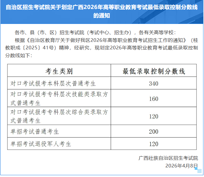广西壮族自治区2026年职教高考对口考试、单招考试各批次志愿填报时间为: