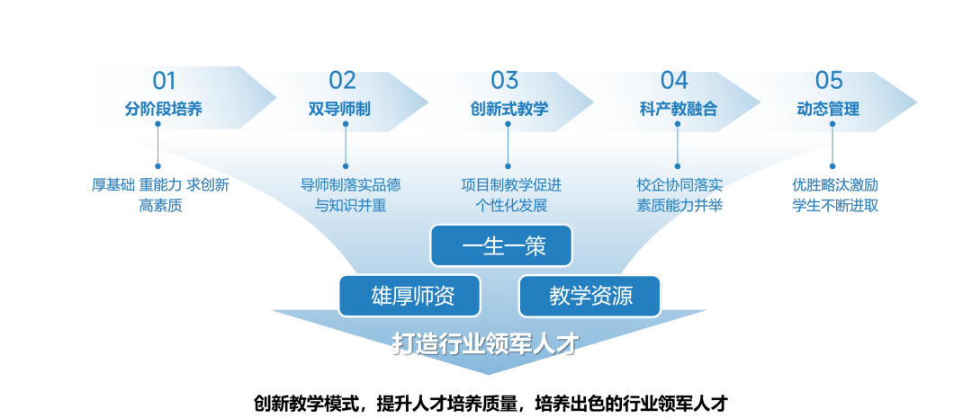在全学院、知名高校和企业以及知名校友范围内选拔优质师资,组成导师团队,落实全程覆盖的“双导师制”,帮助每个学生量身定制专业规划,确保每个学生跟导师进团队、进项目,通过项目实践促使其及早地将知识转化为能力,并通过导师的培养树立学生的高尚品质和远大理想。