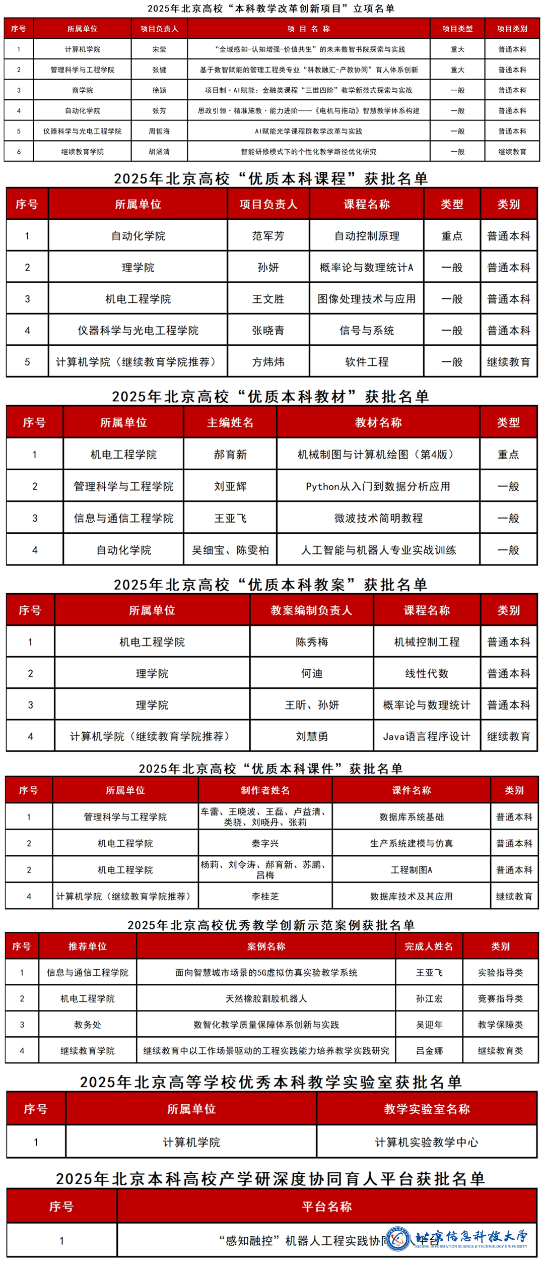 近年来,学校始终牢记为党育人、为国育才初心使命,紧扣国家信息产业发展与首都发展战略需要,不断深化本科教育教学改革,加强优质教学资源供给,深入推进产教融合、科教融汇,加快构建信息特色鲜明的高水平应用型人才培养体系。此次多项市级教学成果集中获批,是学校坚守立德树人根本任务、深化教育教学改革、强化实践育人与创新驱动的重要成果。