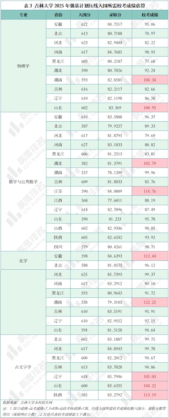 从入围最低分倒推各专业录取所需校考成绩可见,吉林大学2025年强基计划校考门槛较高:校考满分100分、合格线60分,但各专业估算录取分数线普遍超80分,压线入围考生需在校考中斩获高分方有录取可能。
