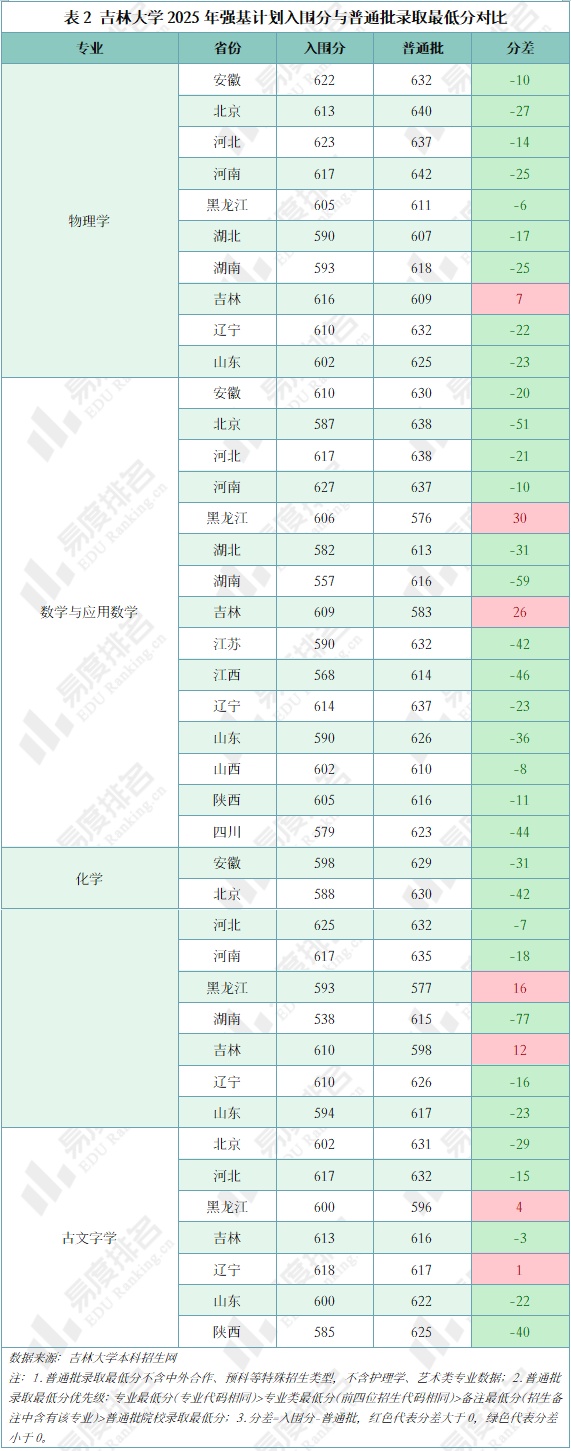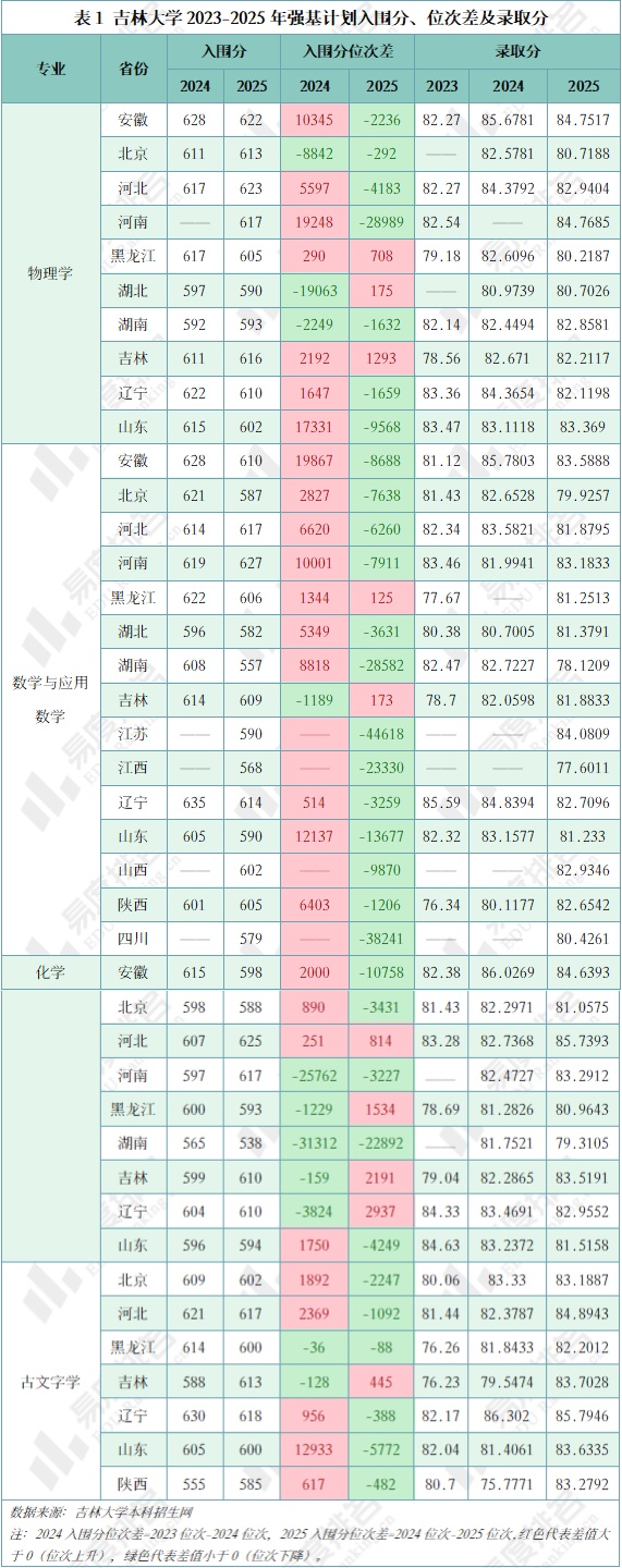 吉林大学2025年强基计划设物理学、数学与应用数学、化学、古文字学4个招生专业。对比2024年招录数据,呈现出位次与分数分化的特征: