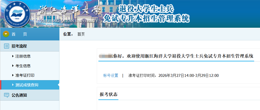 4.综合测试成绩查询:通过浙江海洋大学本科招生网,登录“免试专升本招生管理系统”(准考证打印的系统)后点击左边栏“测试成绩查询”进行查询,如下图所示: