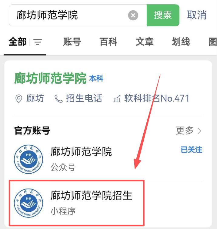 3. 搜索并进入【廊坊师范学院招生】小程序。