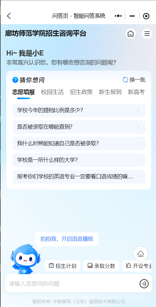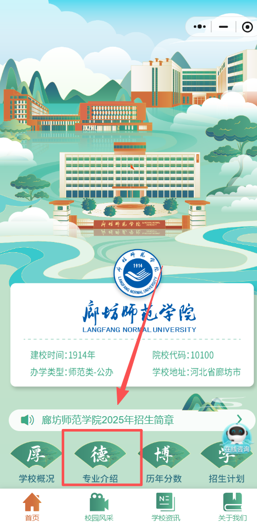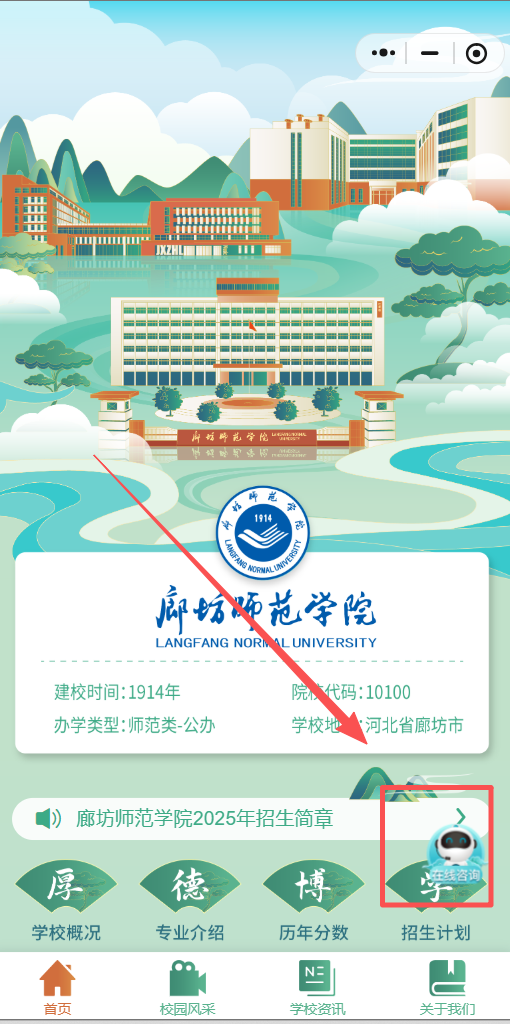 针对考生及家长的热点问题与个性化疑问,廊坊师范学院开通线上招生咨询通道,提供便捷咨询服务。点击小程序首页“在线咨询”,即可快速提问、获取官方解答。