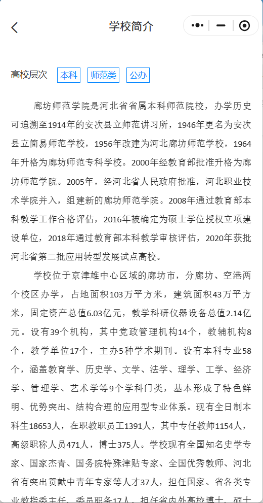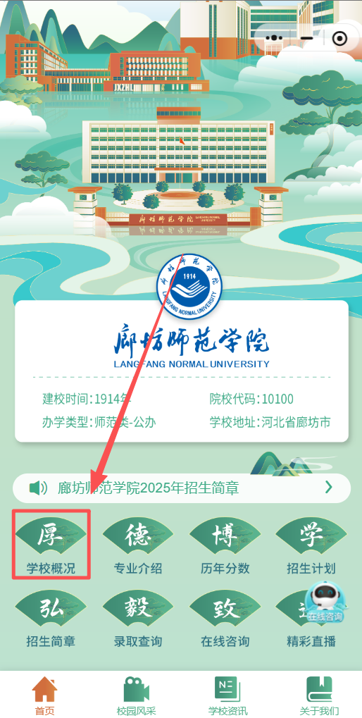 01 校园概况首页下滑,可以看到【学校概况】版块,在这里你可以了解到廊坊师范学院的学校情况、历史沿革和办学条件,提前为志愿填报做足准备。
