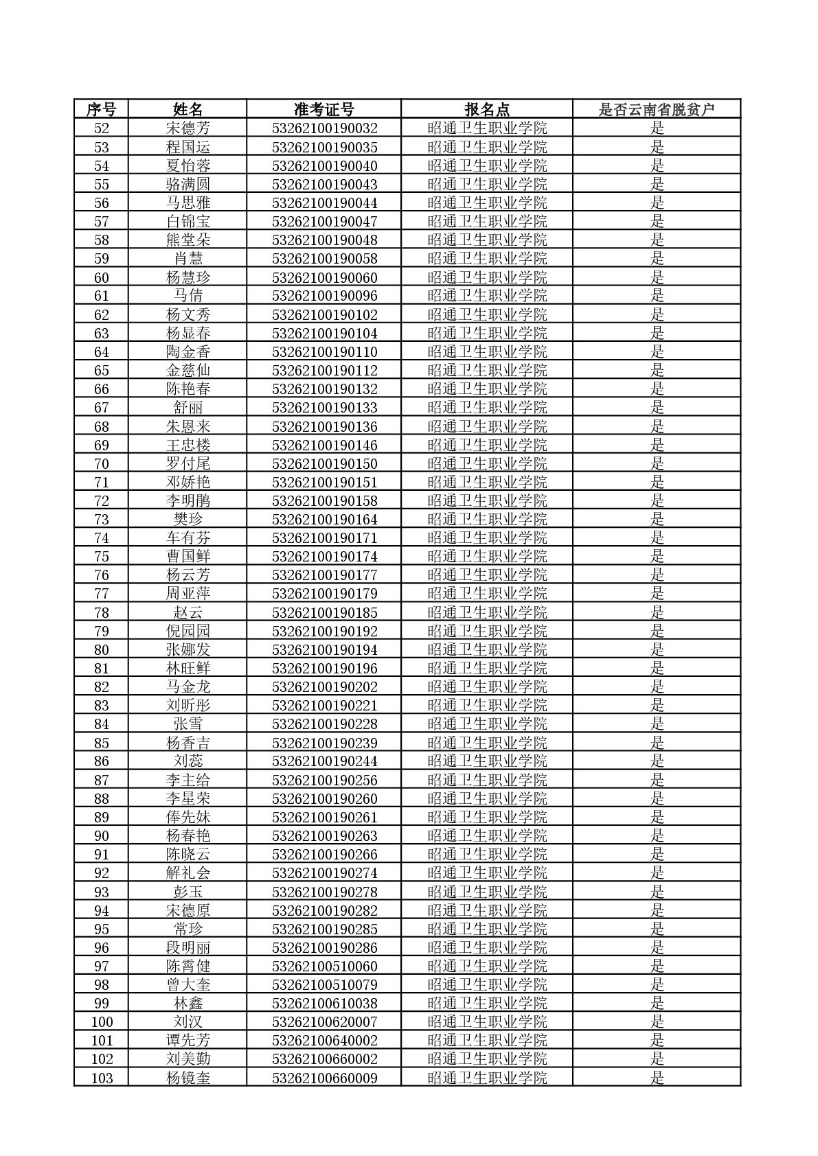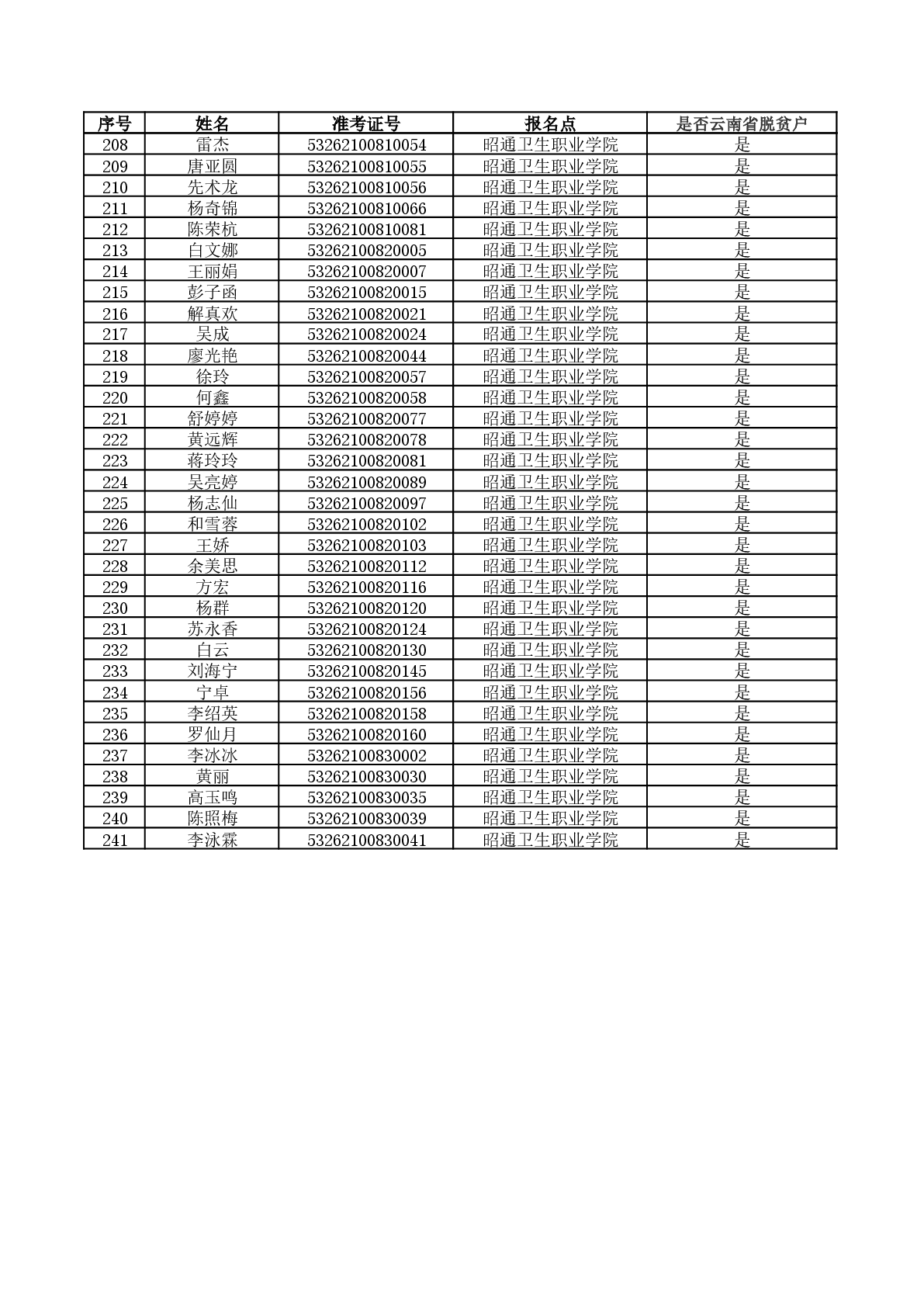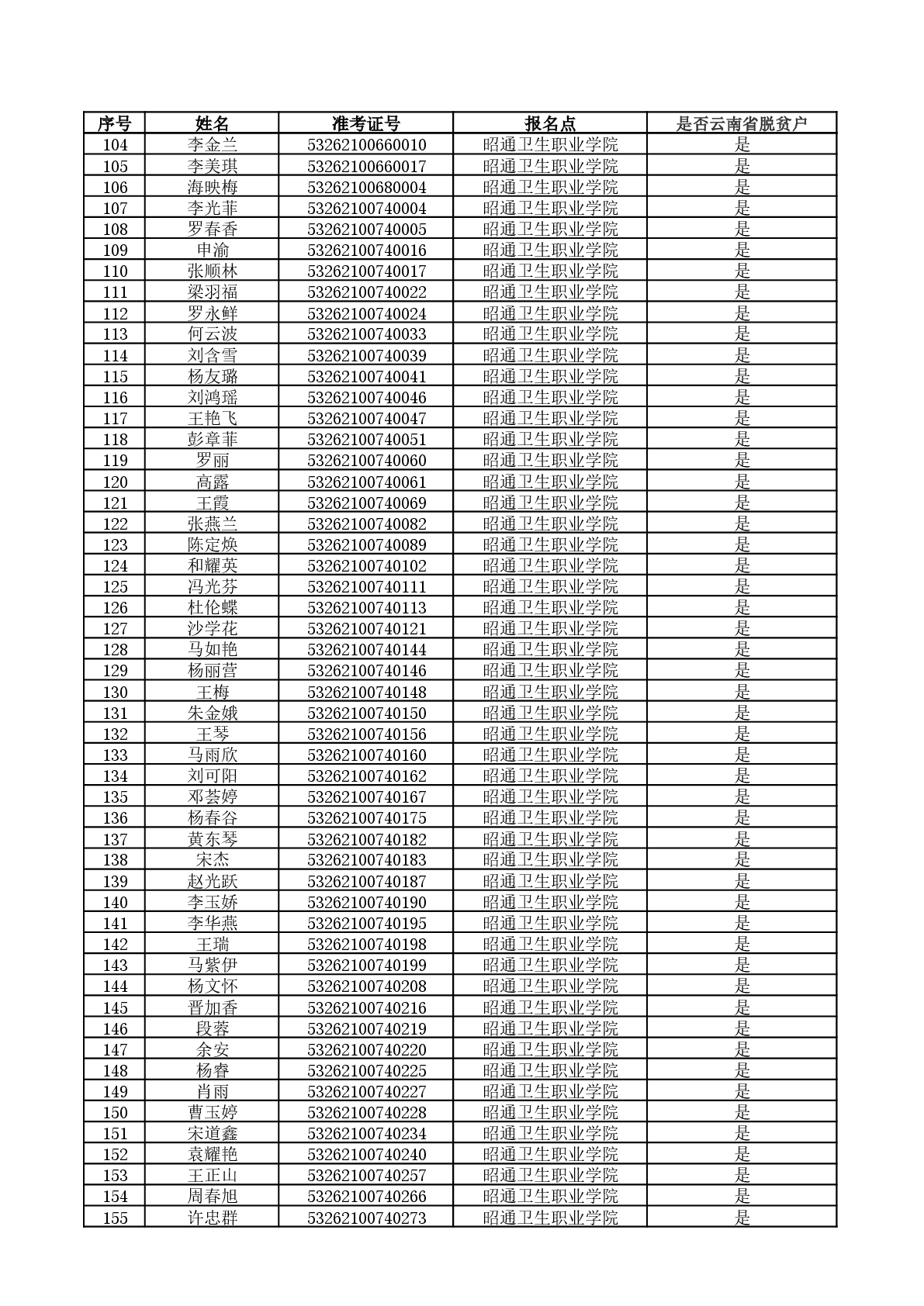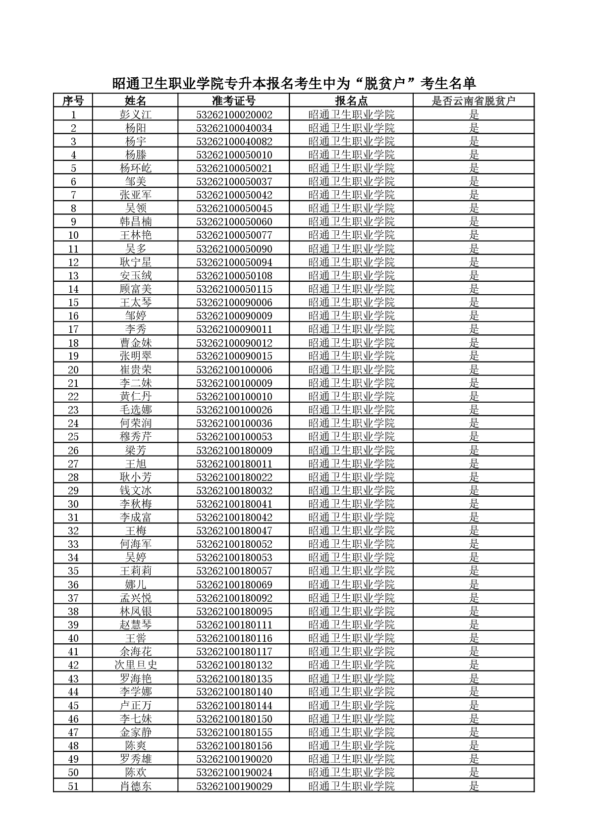 根据《云南省教育厅关于印发2026年普通高校专升本统一考试和免试招生工作办法的通知精神》,云南省原建档立卡脱贫家庭可填报专项志愿,考生资格以云南省农业农村厅比对数据为准,只对专升本报名时选择“是脱贫户”标志的云南户籍考生进行资格审核。经云南省农业农村厅比对,结合专升本报名时考生填报的户籍地信息(必须是云南省户籍),现将比对结果为“是云南省脱贫户”的考生名单进行公式,公示时间为2026年4月19日至2026年4月22日,咨询电话:0870-3188219,0870-3188230。如考生对公示结果有异议,考生需到户籍所在地“县级农业农村局”开具有关证明材料,并于2026年4月22日12:00前将证明材料交到我校教务科招生办公室(联系人及电话:刘锴:13578013225),逾期不再接受考生任何证明材料!