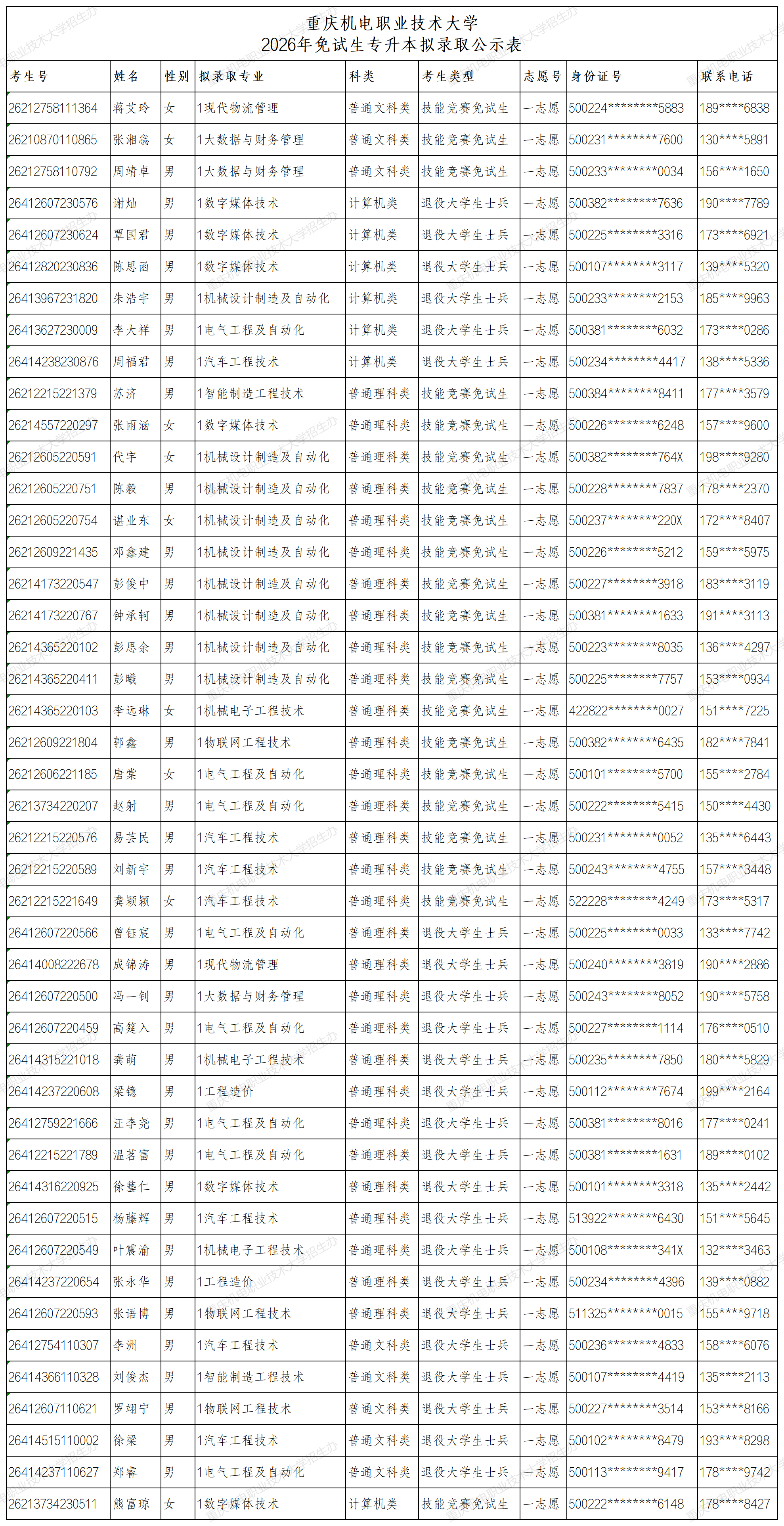 重庆机电职业技术大学2026年免试生专升本拟录取公示表