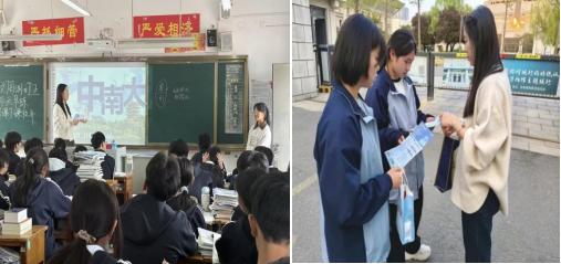 4月9日至12日,王词同学走进沁阳市永威高中,以“遇见中南大,筑梦新征程”为主题开展宣讲,介绍了学校的优势专业和特色学科,各专业课程设置、培养目标、师资力量、就业方向及发展前景。通过个人精心整理的图片、短视频等素材,生动形象地展示了大学生活日常,从课堂上的专注研讨,到课余时间的丰富体验,全方位、多角度地展现了从高中到大学的成长蜕变,帮助高中生建立起对大学的真实认知。