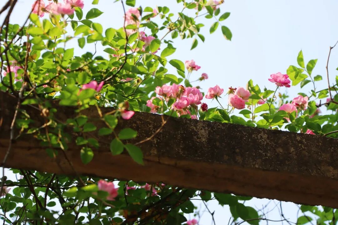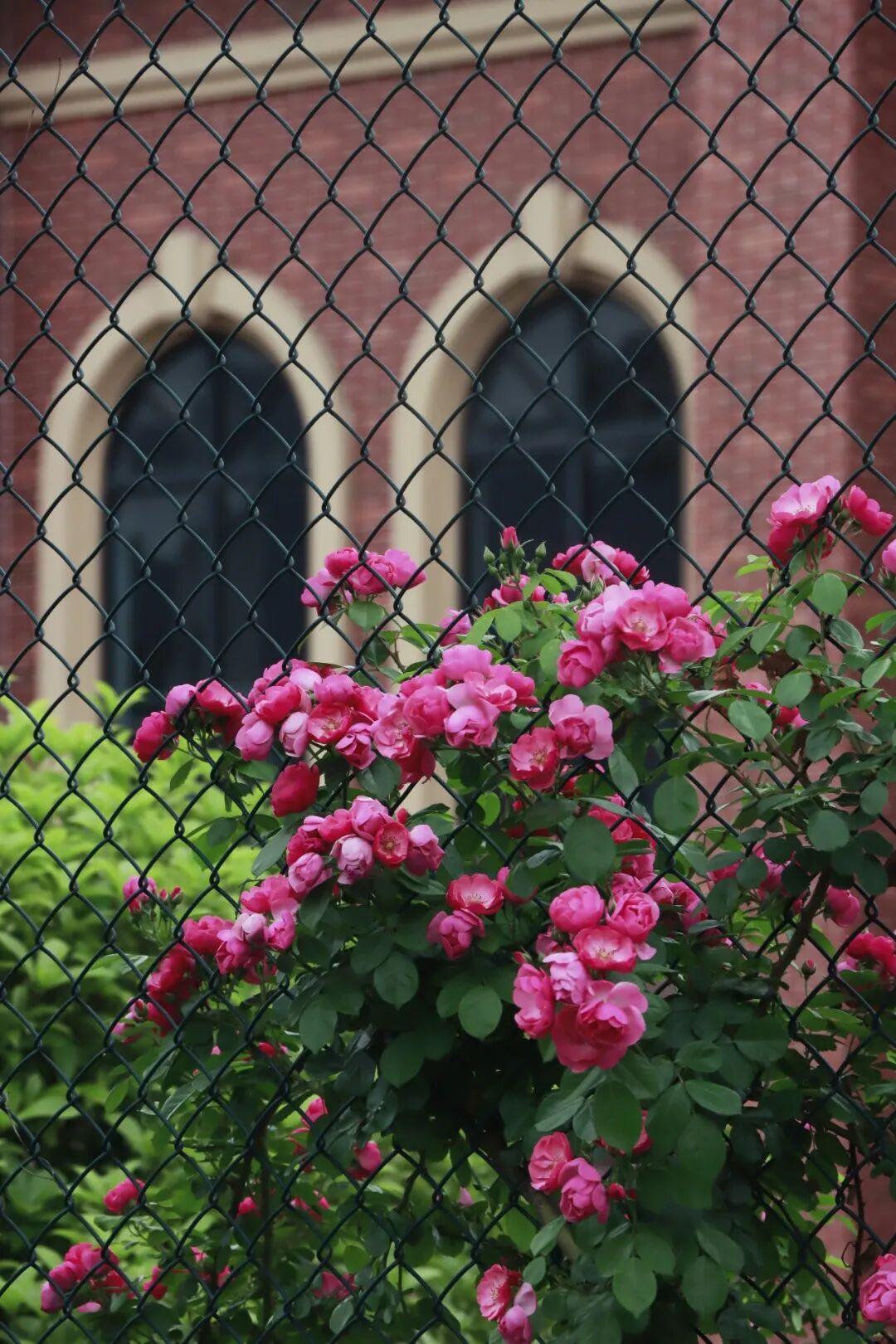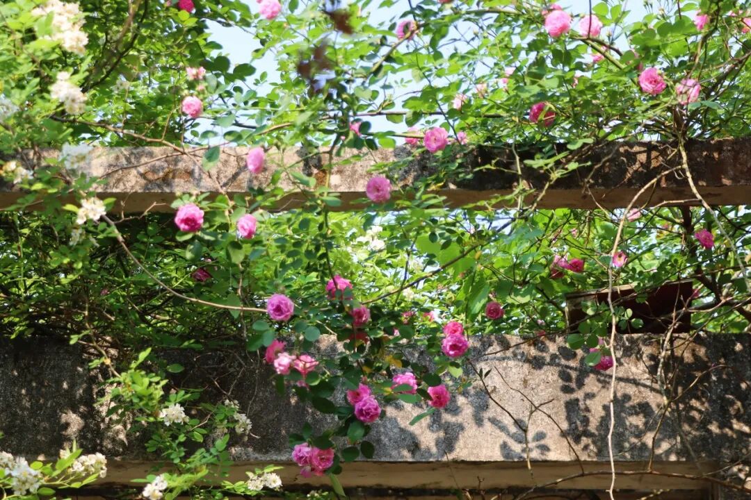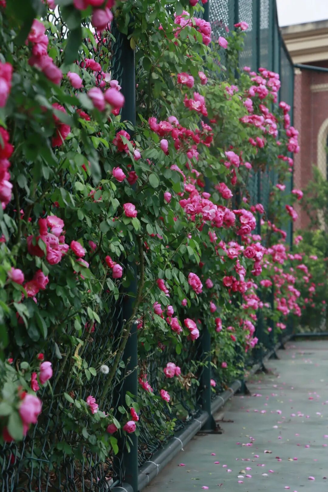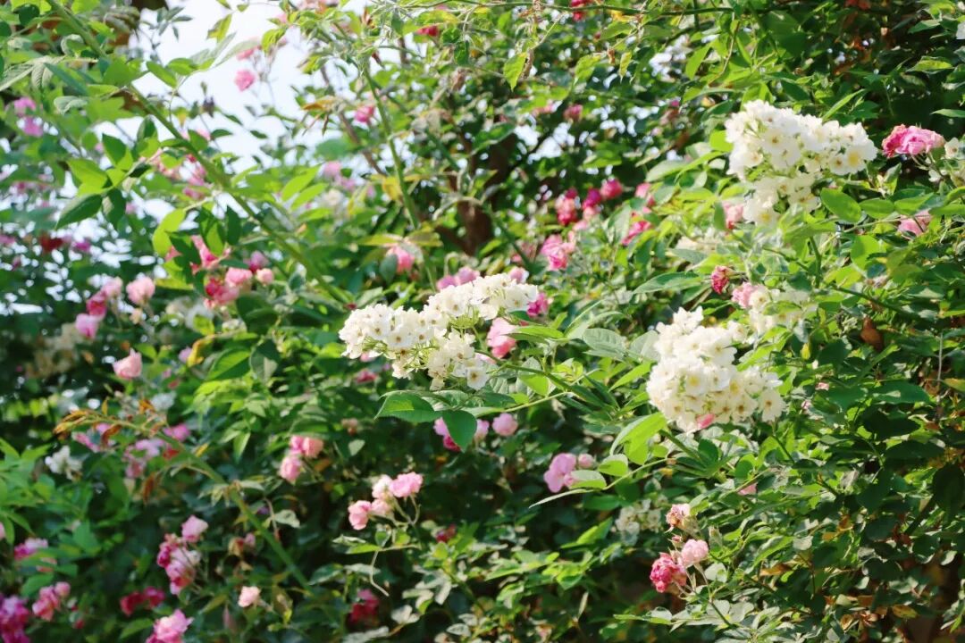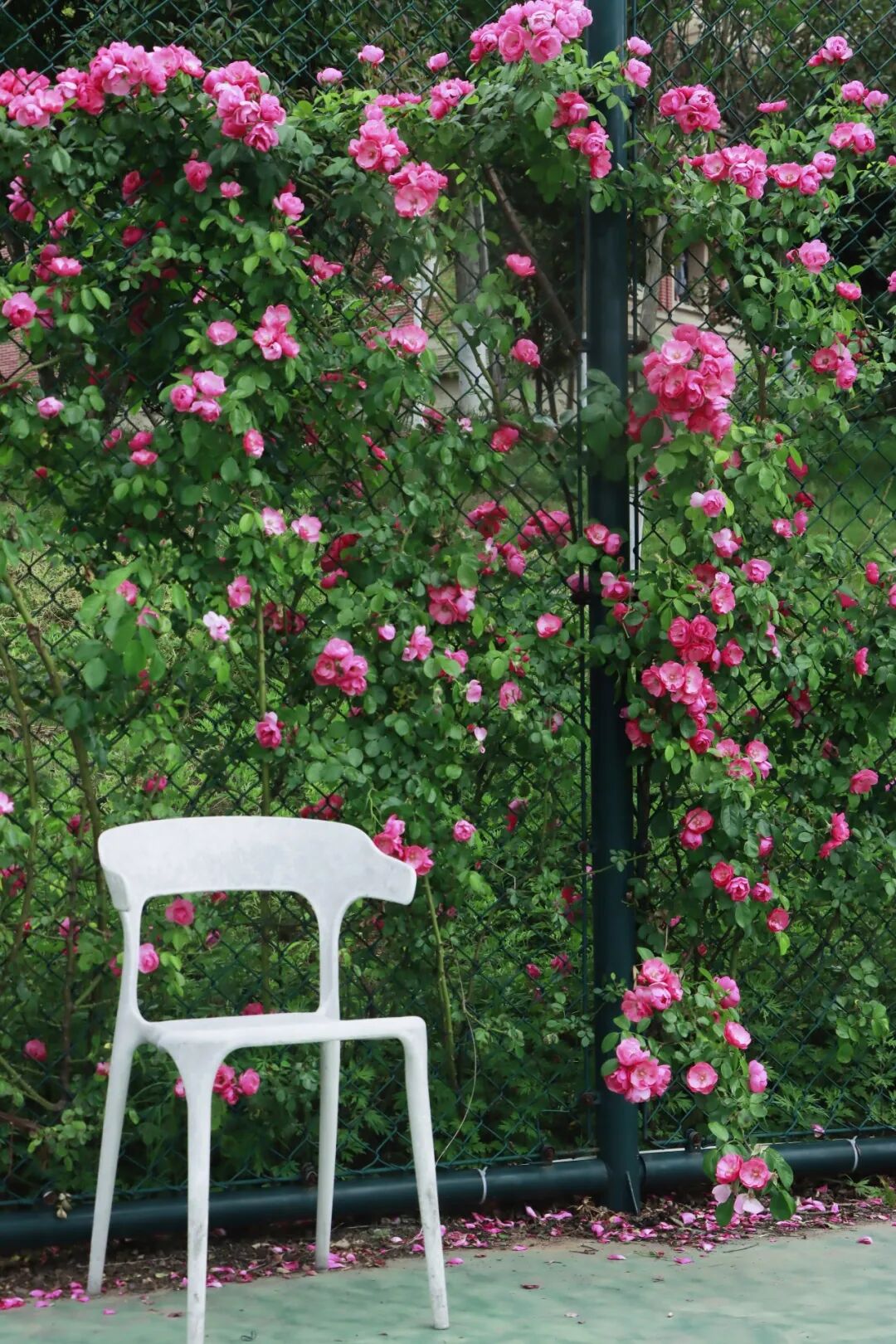 粉白的花簇顺着藤蔓蔓延攀过铁艺围栏