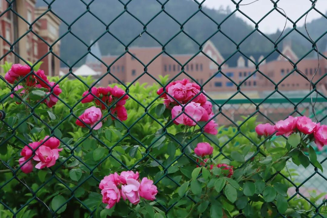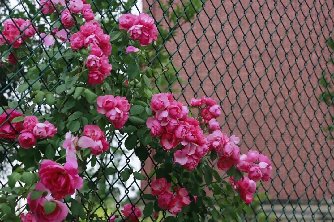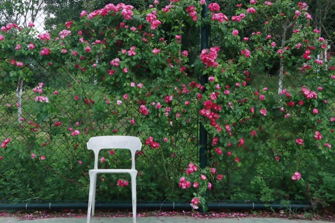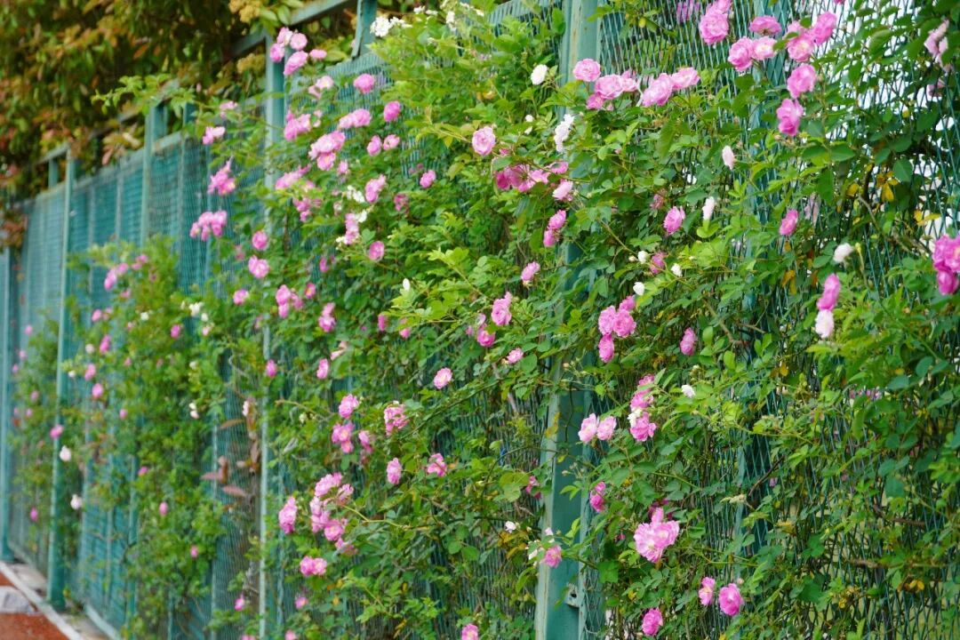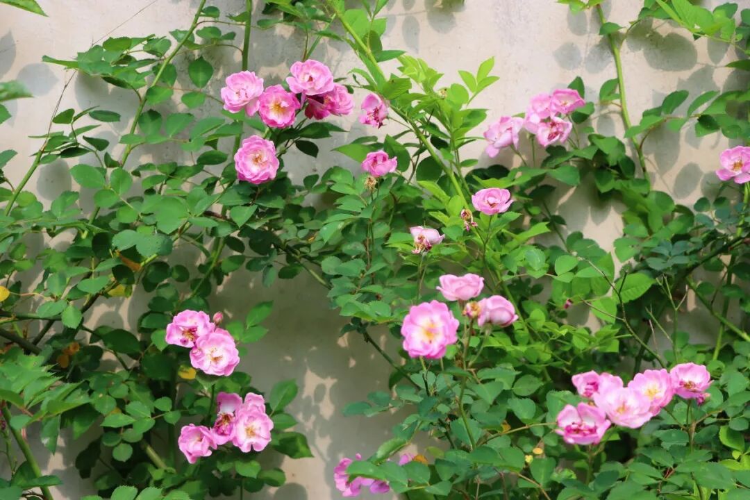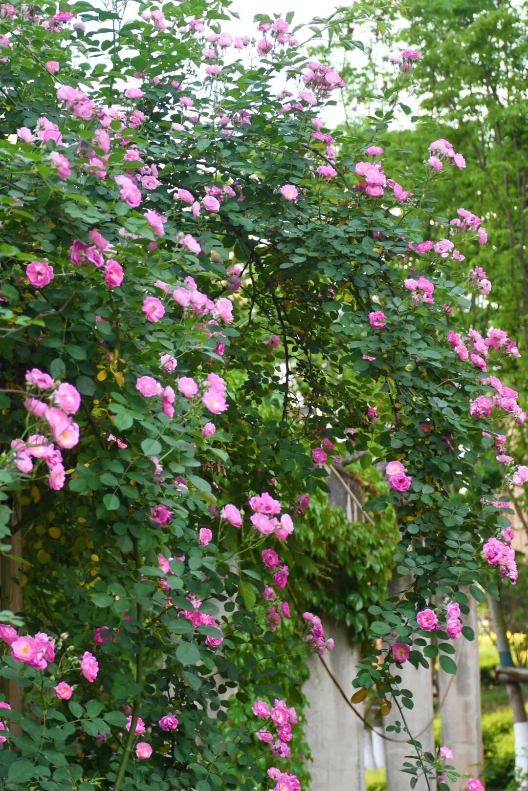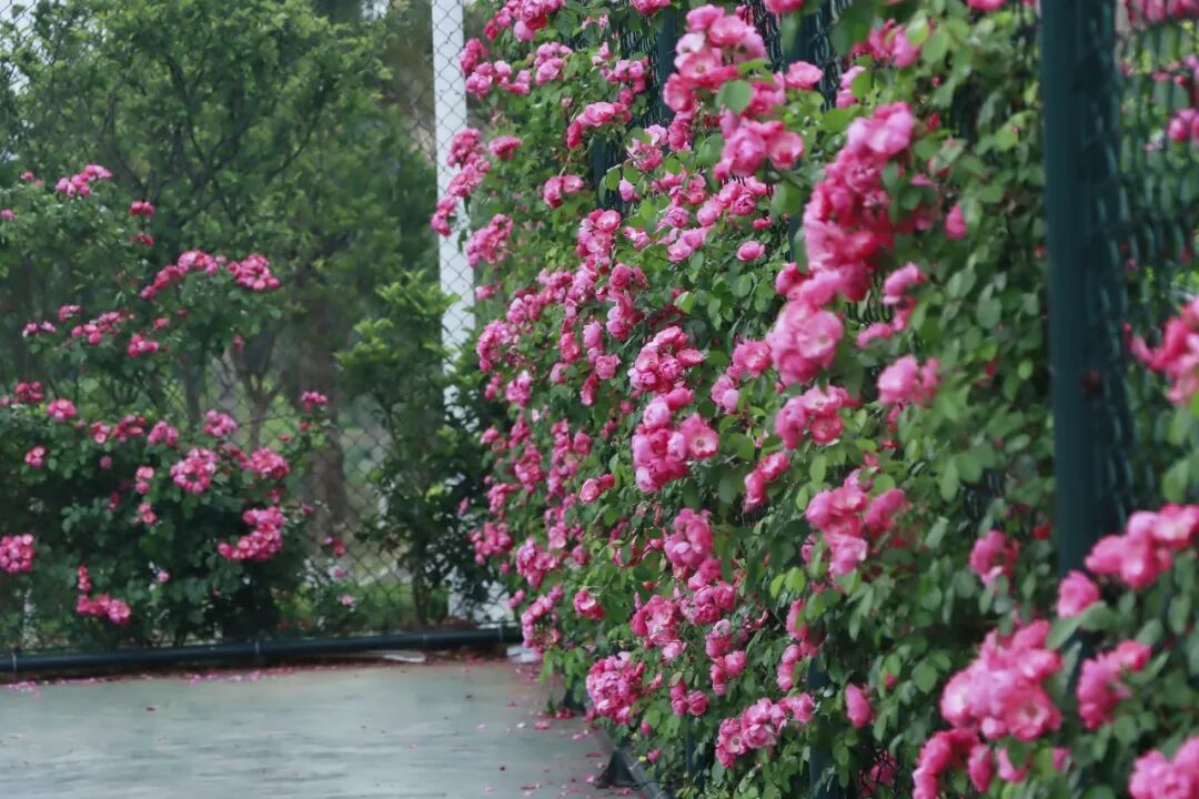 粉白的花簇顺着藤蔓蔓延攀过铁艺围栏