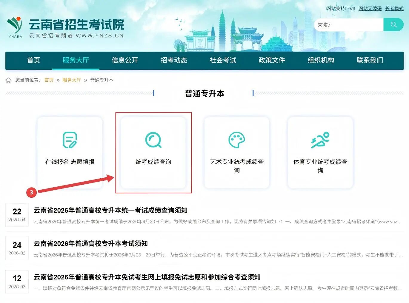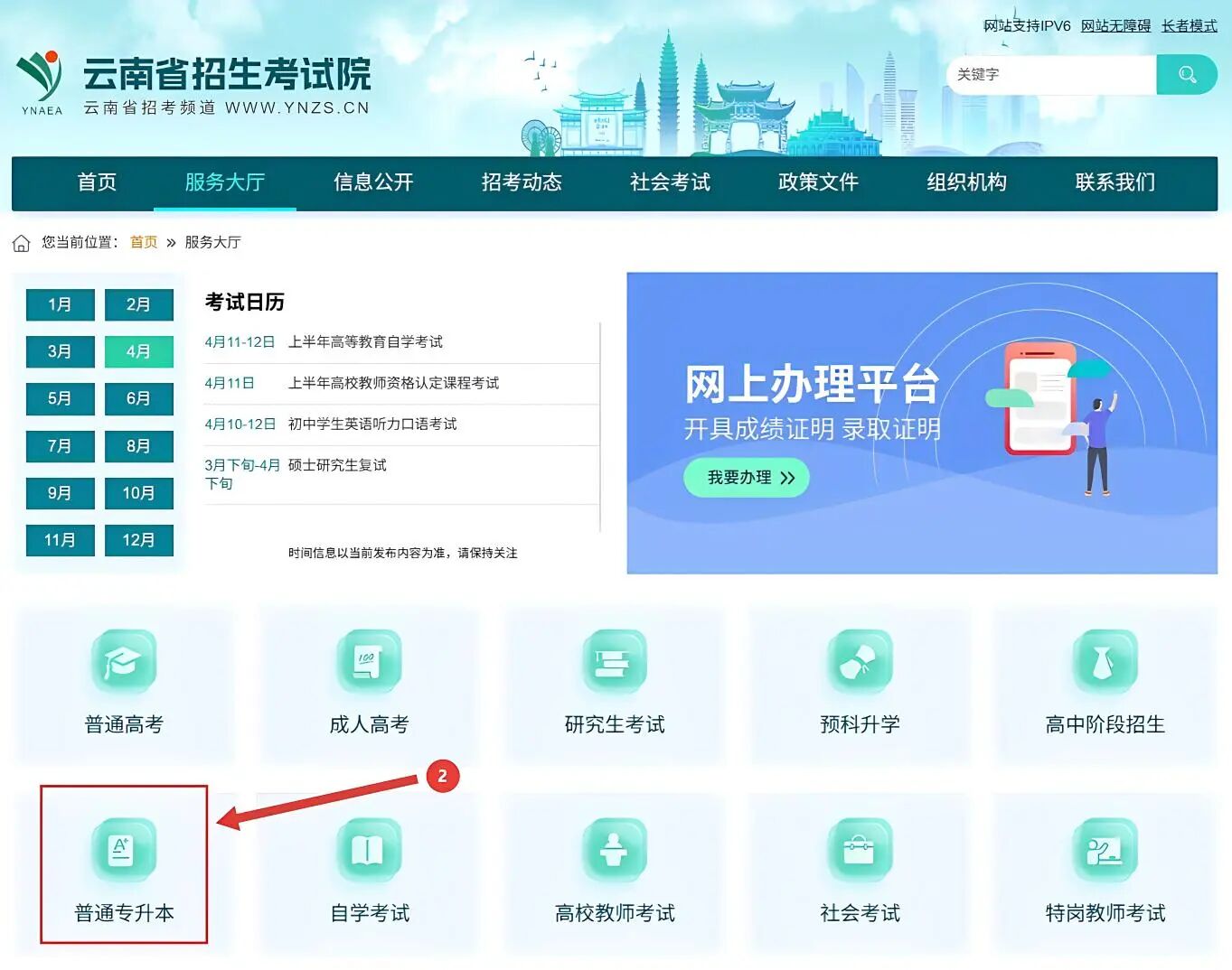 登录“云南省招考频道”(www.ynzs.cn),点击“服务大厅”
