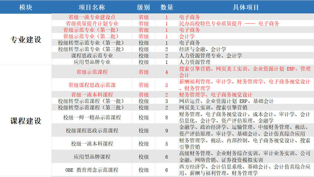 质量工程一览表(19个省级,1个市厅级,58个校级)