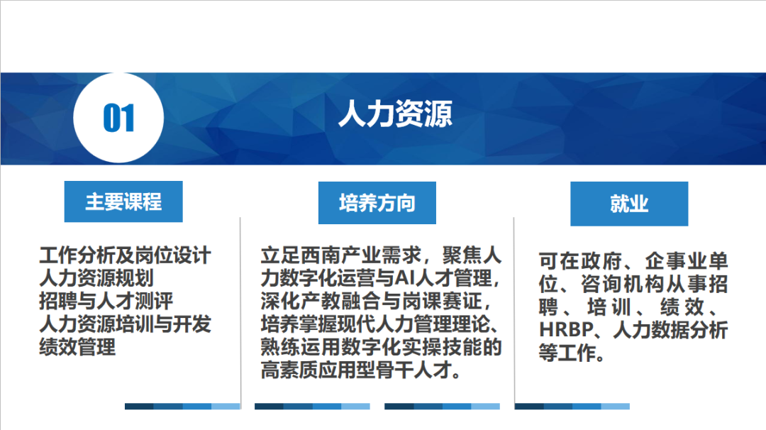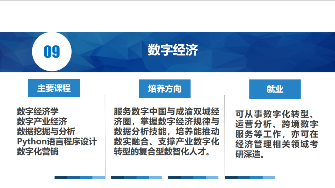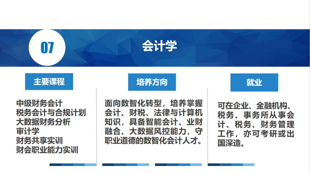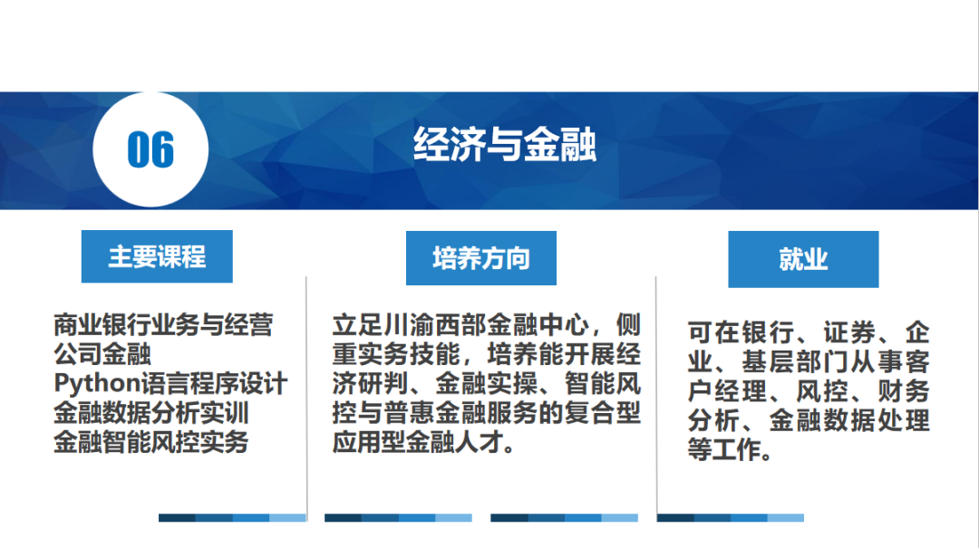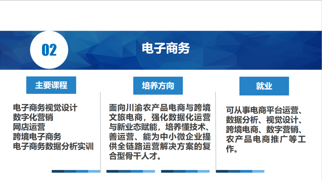 专业集群优势显著:涵盖经济学、管理学两大学科门类,构建“数字技术+商科管理”交叉融合专业体系。现有四川省一流本科专业1个(电子商务)、四川省应用型示范专业2个(会计学、电子商务),专业布局紧贴行业趋势,就业前景广阔。
