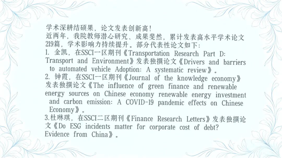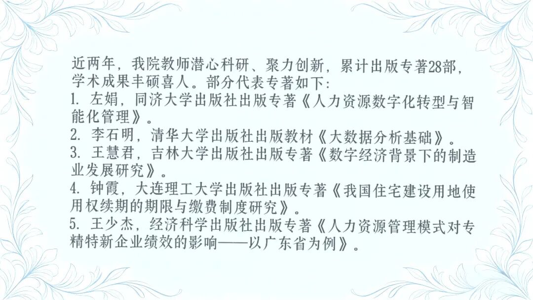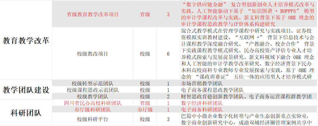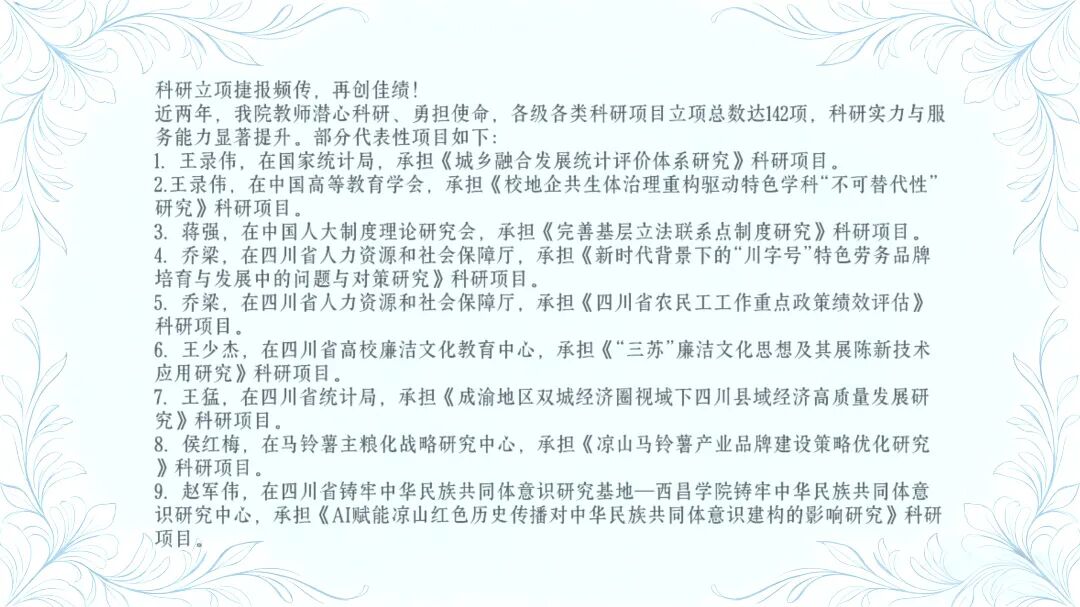 学院坚持应用科研反哺教学,聚焦产业数智化与转型升级、数字产业与平台经济两个科研方向,积极构建科研平台体系,开展有组织科研。学院建有3个校级科研平台、4个博士工作室及19个院级科研团队,承担国家统计局、中国高等教育学会、中国金融法研究中心等科研项目多项,近两年立项纵向科研项目142项,发表论文219篇,出版专著28部;承接横向科研项目140余项。学院发挥人才智库和校地合作纽带作用,依托学科专业优势服务地方经济社会发展,1项咨政报告获国务院领导批示,多项咨政报告获四川省政协、中国民主建国会四川省委员会等单位采纳,多名名教师获得中国民主建国会中央委员会等单位感谢信。为区域经济发展提供了有力的人才与智力支持,充分彰显了学院服务地方经济社会发展的使命与担当。