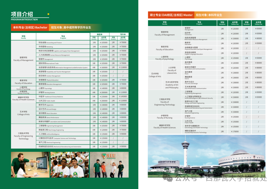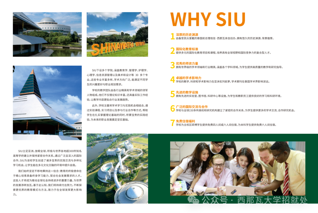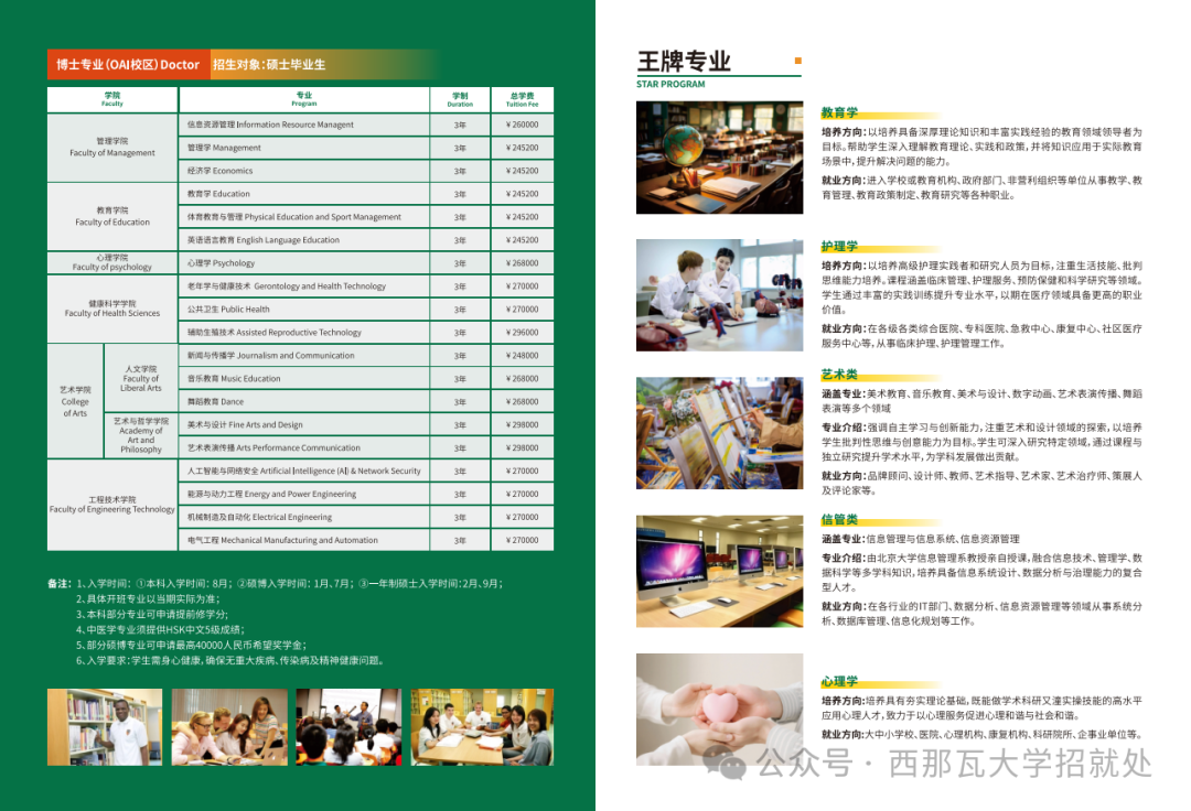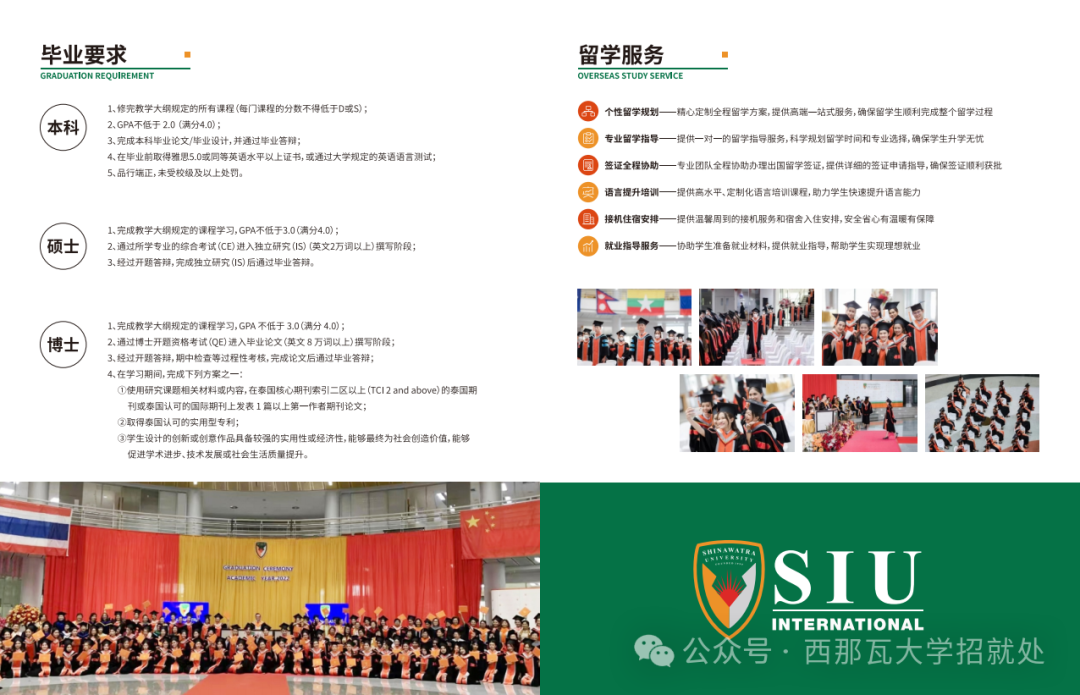 目前,我校泰国西那瓦国际大学培养本科、硕士和博士,专业开设非常齐全。如大家关心的电气工程、机械、计算机、新能源、教育学、管理学、经济学、护理学、中医学、养老管理、人工智能、新闻学、艺术类等等专业都有。