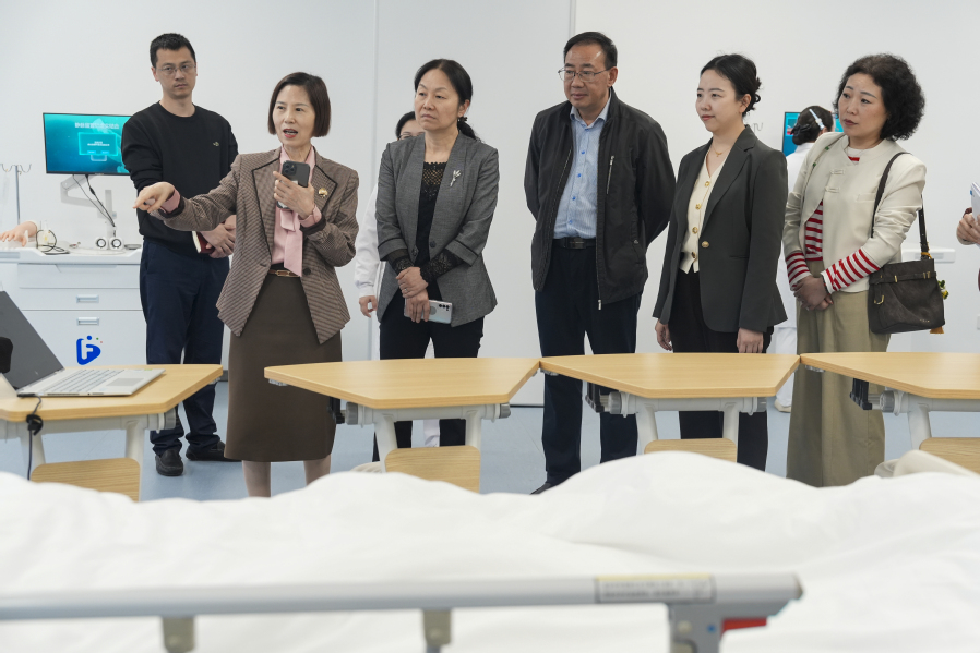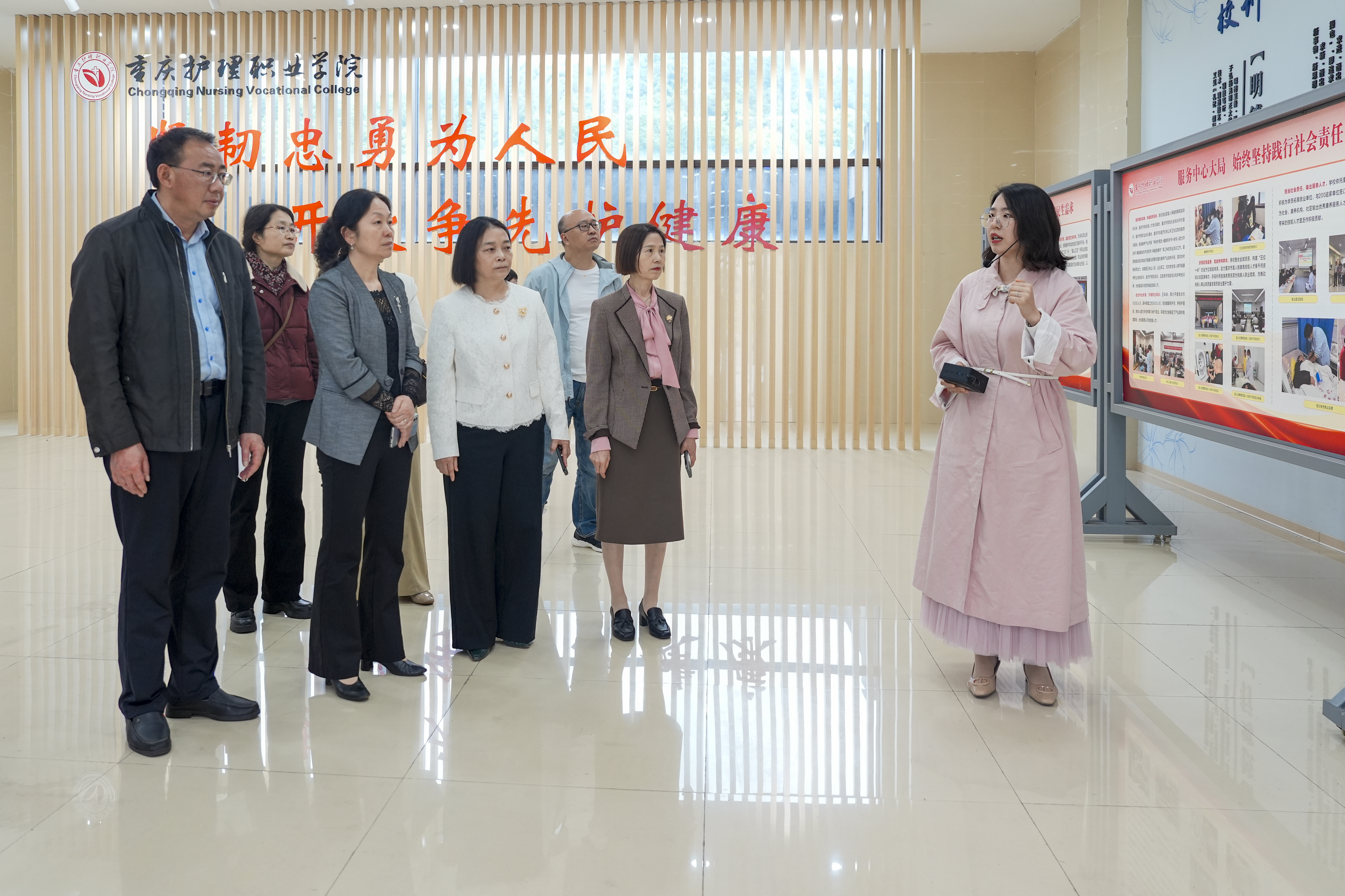 石鹏一行先后参观了学校特色工作主题展板、重庆市高水平护理专业群实训中心、标准化OSCE考试中心,详细了解学校专业设置、师资力量、就业及社会培训等相关工作,听取了学校在服务区域产业发展、深化“医养教”人才培养模式的创新举措与实践成果。