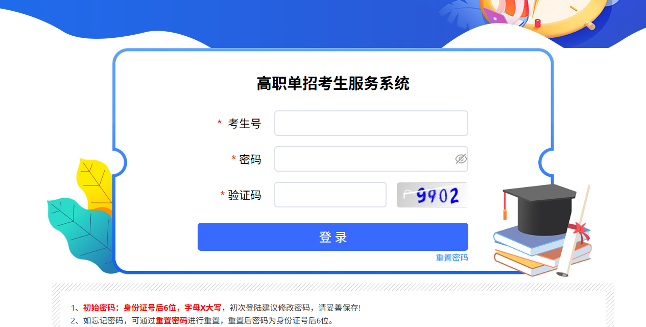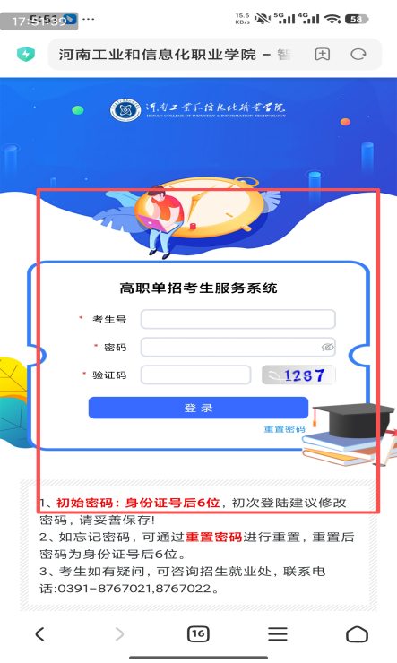 1.访问我校单招系统(网址:http://kscx.hciit.edu.cn/casdz),建议使用360浏览器(极速模式)或者谷歌浏览器,在输入框内输入考生号和密码(密码默认为身份证后6位,X要大写)登录系统(初次登录后可更改密码)。