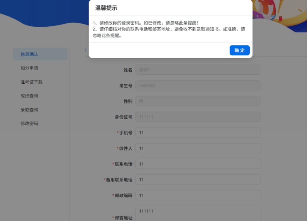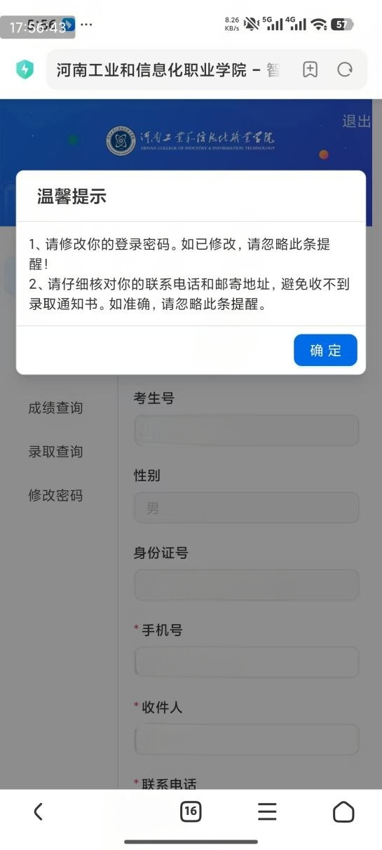 2.登录成功后,会弹出提醒,如果当前时间段可以修改自己的联系信息,修改后保存即可。如果不能修改,请关注学校的通知,在允许的时间内,及时确认修改自己的信息。