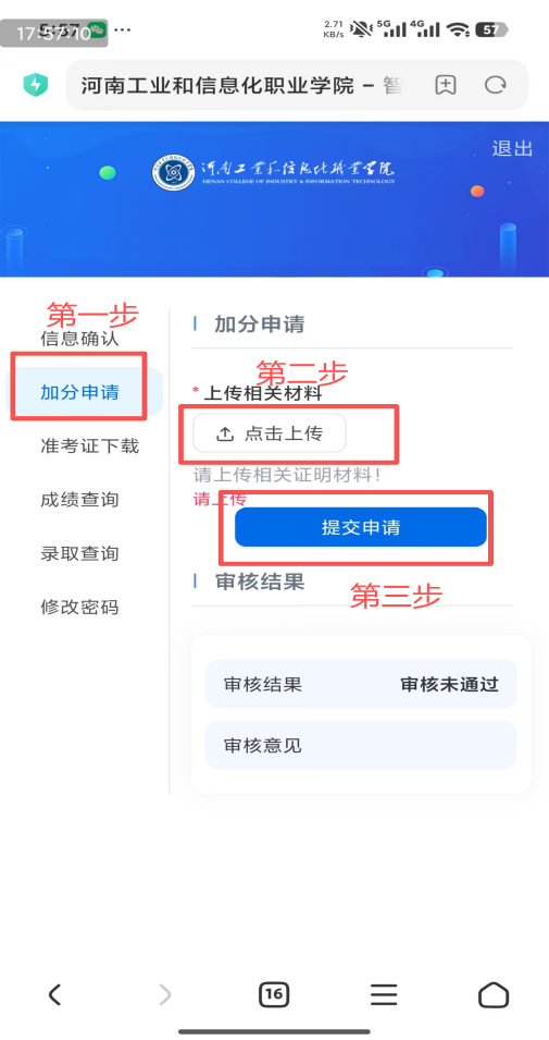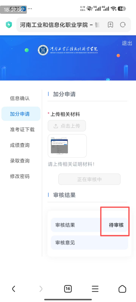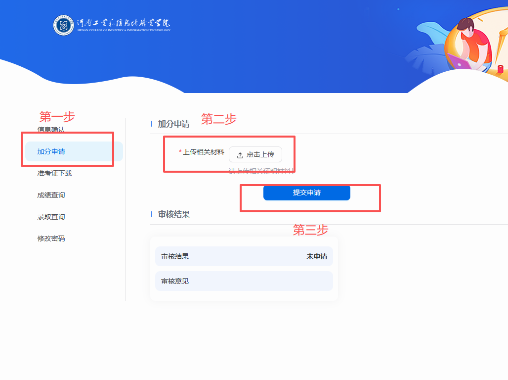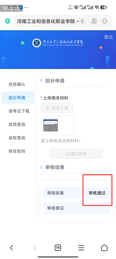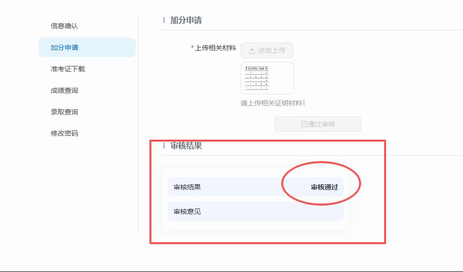 4.考生上传的证书经我校集中审核后,将通过本系统反馈审核结果。届时点击左侧导航“加分申请”按钮可以查看审核结果。