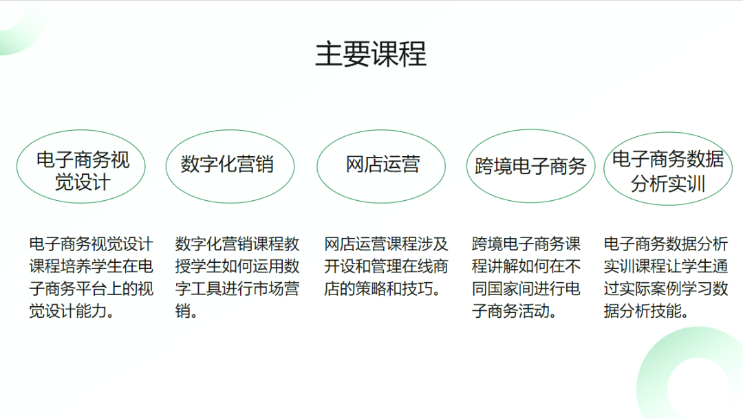 就业:电子商务平台运营,电子商务数据分析,电子商务视觉设计,产品经理,跨境电商,特色文旅推广、农产品电商运营与推广、前端开发,数字化营销等方面工作。