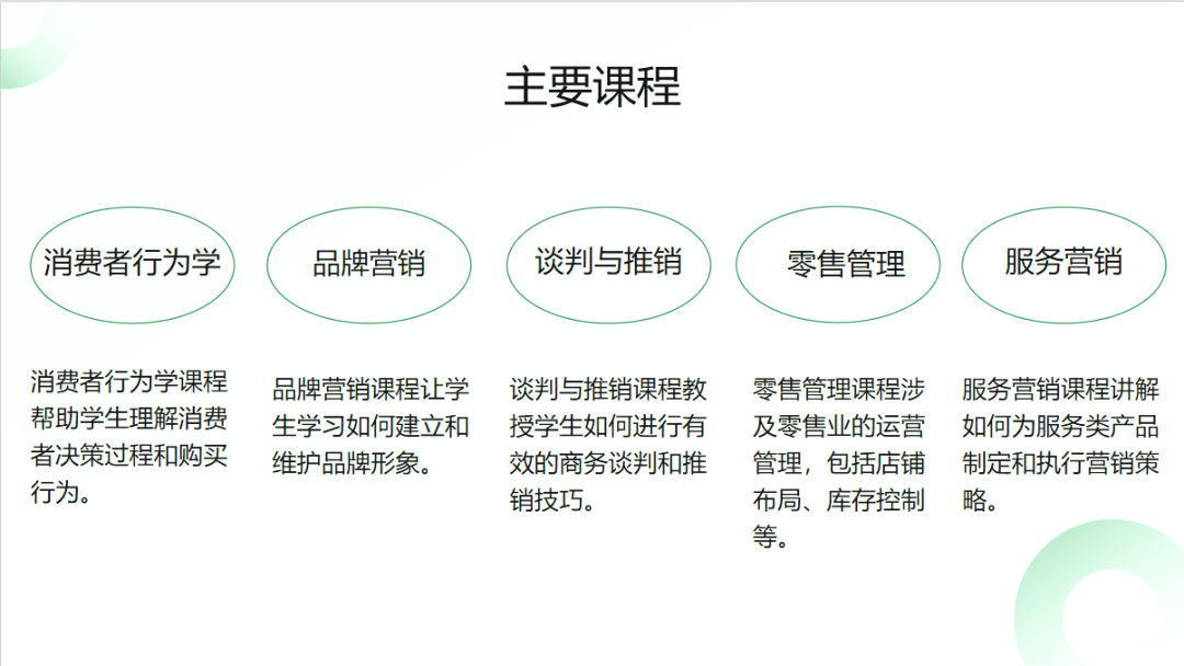 就业:毕业生就业前景广阔,既可报考公务员、事业单位或继续深造攻读硕士研究生,也可在消费品、智能制造、数字经济、绿色能源等行业,从事数字化营销策划、品牌数智化运营、市场数据分析、智能广告投放等岗位,成为企业数字化转型中急需的营销骨干。