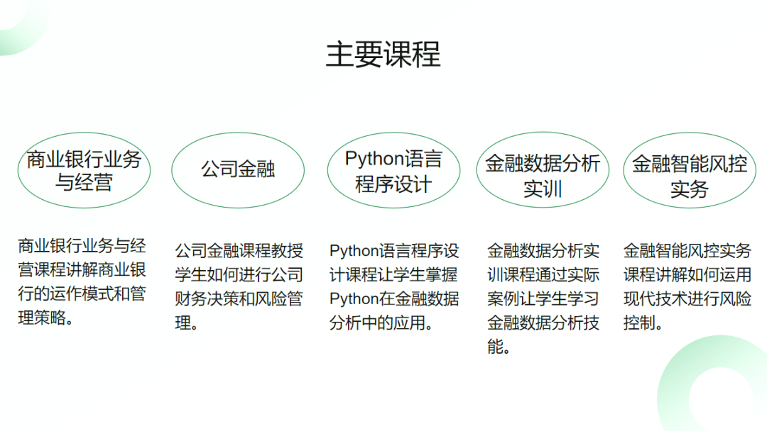 本专业立足川渝,锚定成都西部金融中心建设,聚焦金融科技与绿色金融,构建“夯基础+强技能+重实践”培养体系,依托校企订单班与“课岗赛证”模式,强化实操能力。毕业生面向银行、证券、保险、基金等金融机构、中小微企业及政府部门,可胜任客户经理、风控专员、财务分析、金融数据处理等岗位基础工作,就业面广、适配度高。