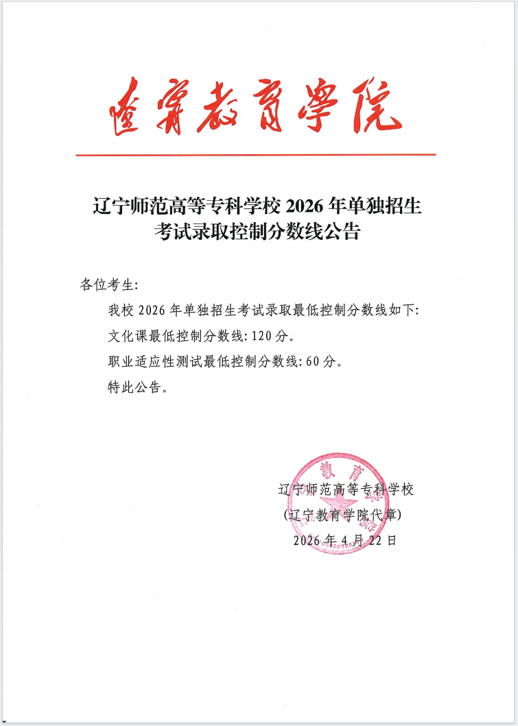 辽宁师范高等专科学校2026年单独招生考试录取控制分数线公告