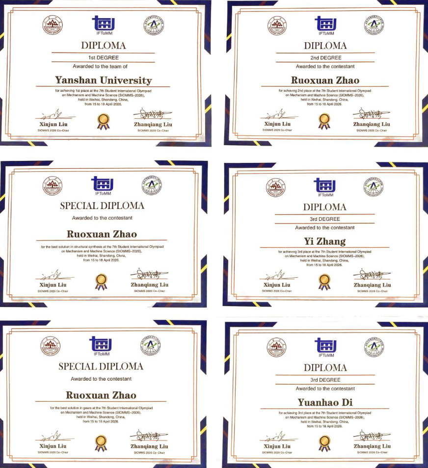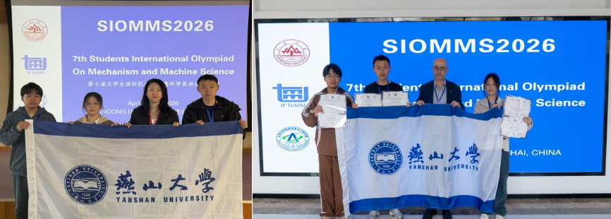 2026年4月15日至18日,第七届大学生国际机构与机器科学奥林匹克竞赛(SIOMMS 2026)在山东大学(威海)举办。燕山大学代表队凭借扎实的专业功底与出色的团队协作,与清华大学、天津大学包揽了本届大赛仅有的三个团队一等奖,创下我校在该项赛事中的历史性成绩。