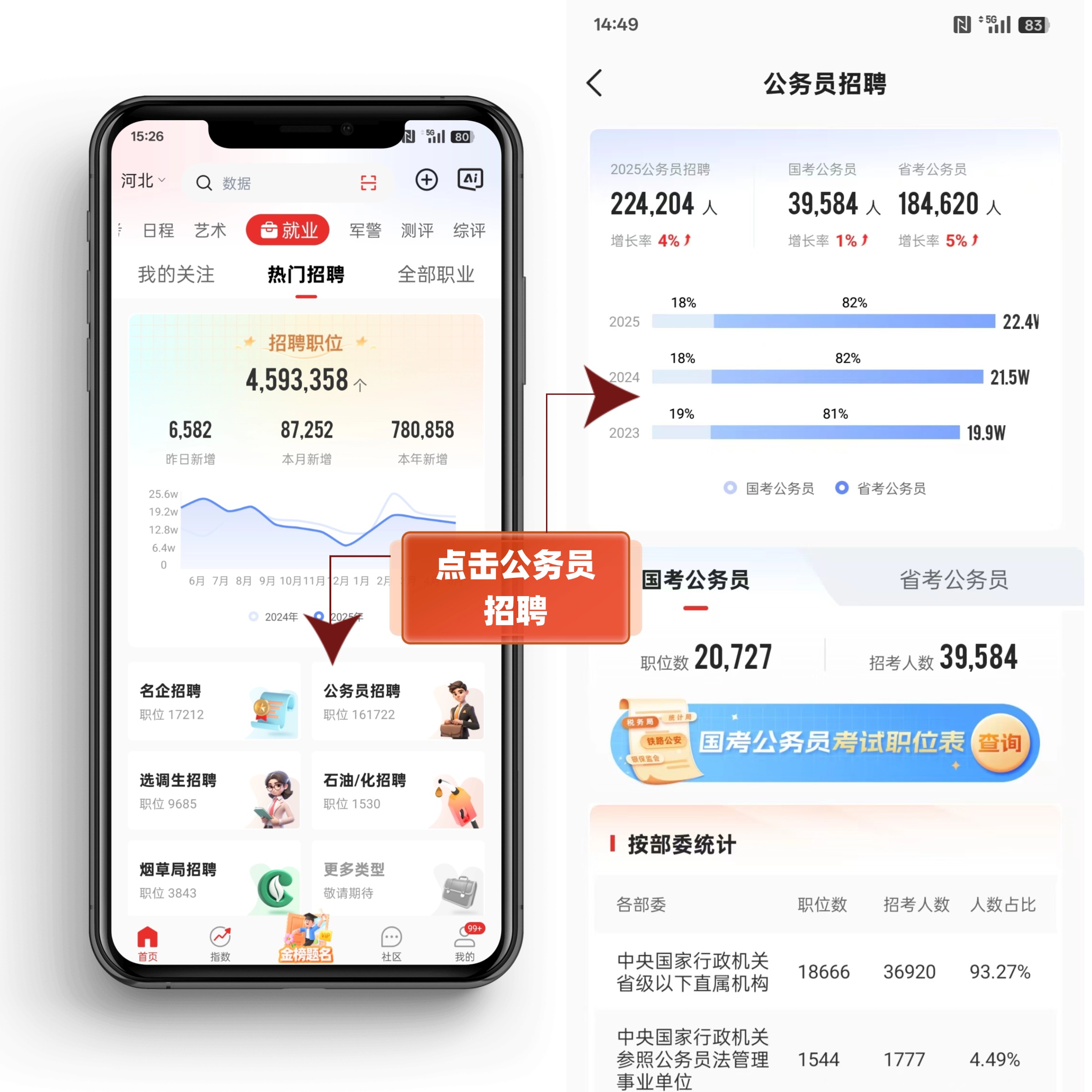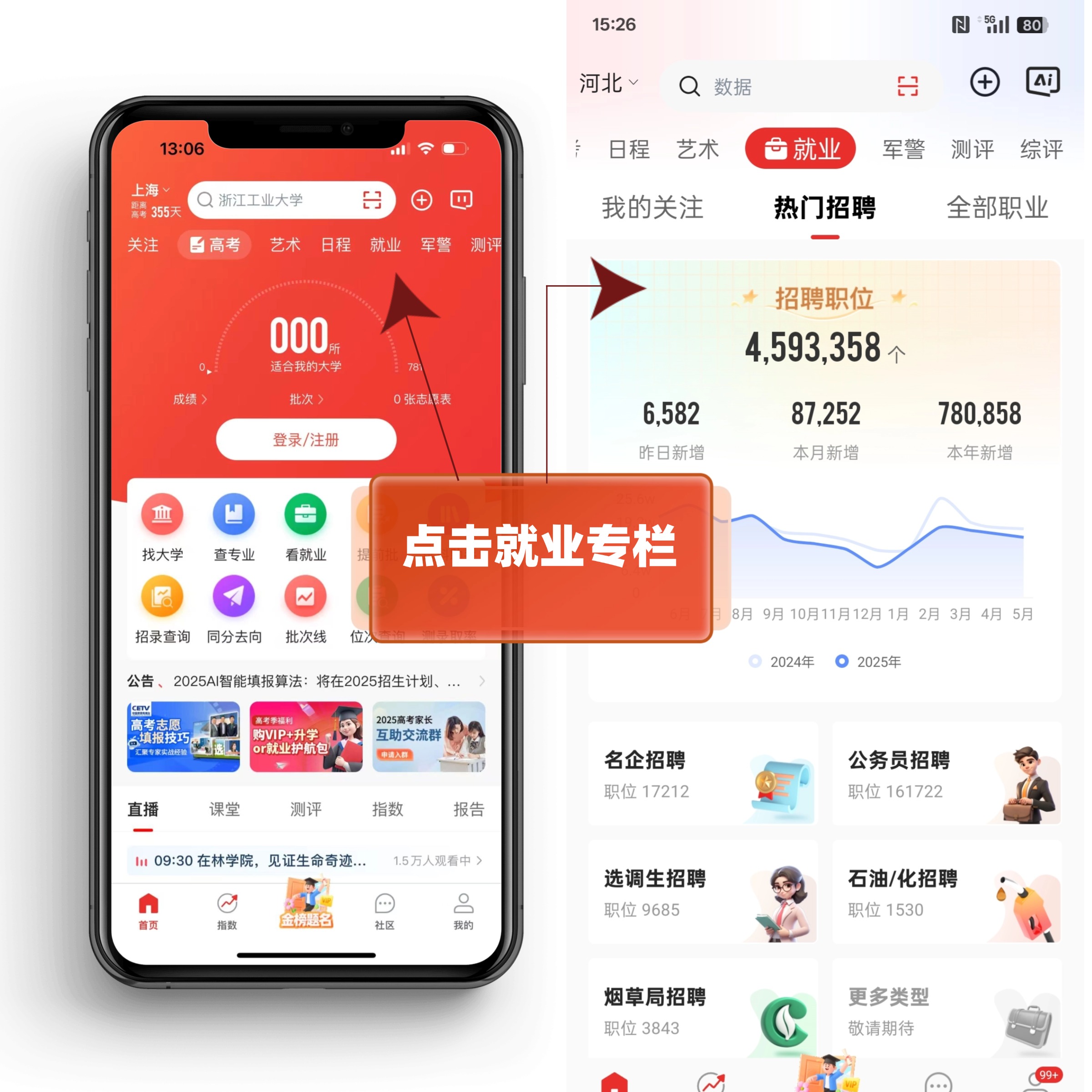 作为高中生,未来想进公务员系统,需要提前摸清公务员招聘的核心要求。在优志愿APP首页导航栏点击【就业】专栏,就能快速进入公务员招聘板块,轻松查看热门招聘信息和各类职业详情,无需繁琐操作,就能获取实用的招考资讯。